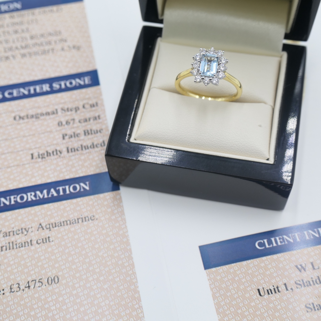 A brand-new, unused certified 18ct yellow and white gold cluster ring, featuring a striking combination of aquamarine and natural diamonds. At its centre sits a 0.67ct octagonal step-cut aquamarine, displaying a refined pale blue tone that captures light with elegant subtlety. Surrounding the gemstone is a halo of twelve round brilliant-cut diamonds, weighing a total of 0.54ct, each graded F–G in colour and SI1–SI2 in clarity. Together, these stones create a radiant contrast, enhancing both the cool hue of the aquamarine and the brilliance of the diamonds. The two-tone gold mount, weighing 4.34g, elevates the design with both warmth and strength.