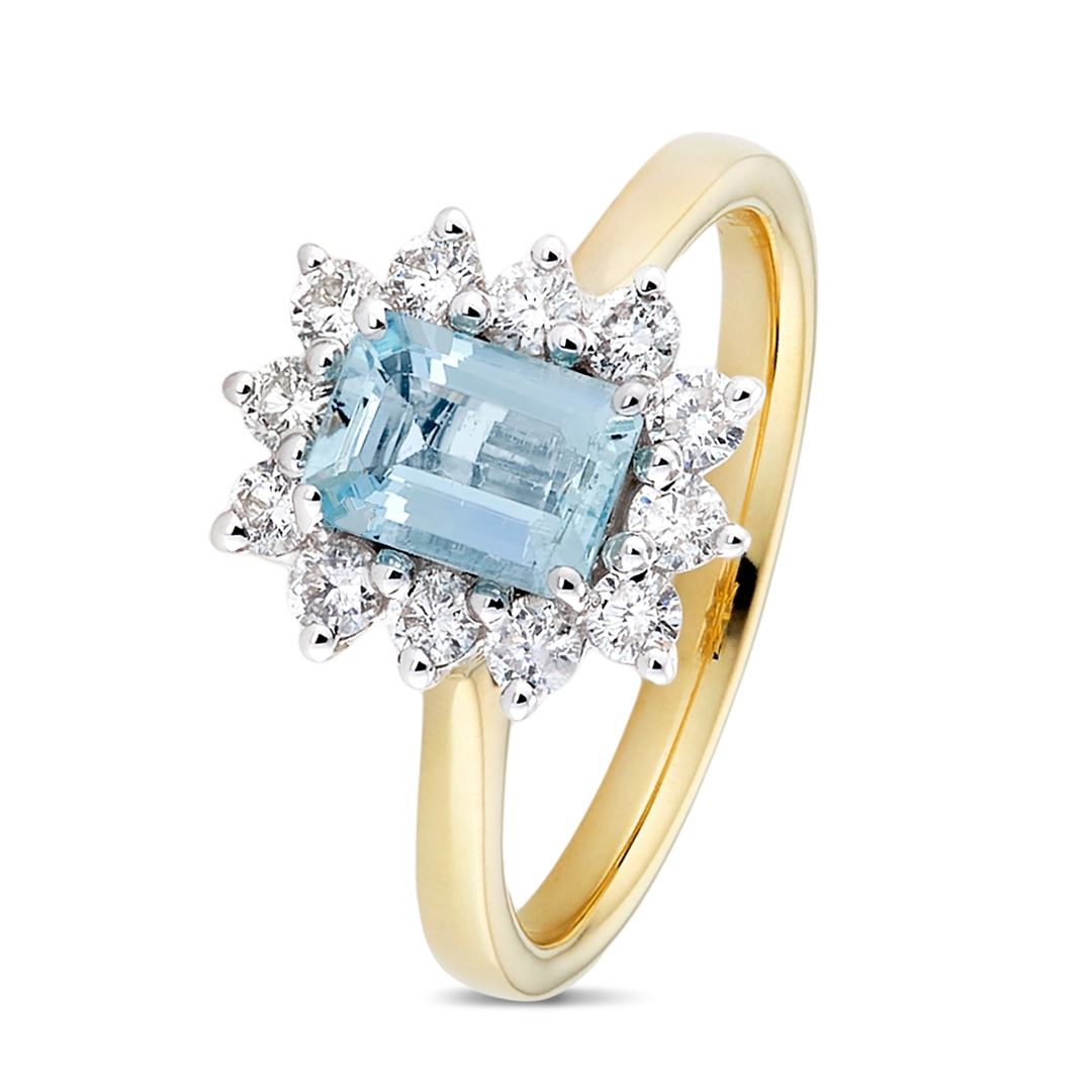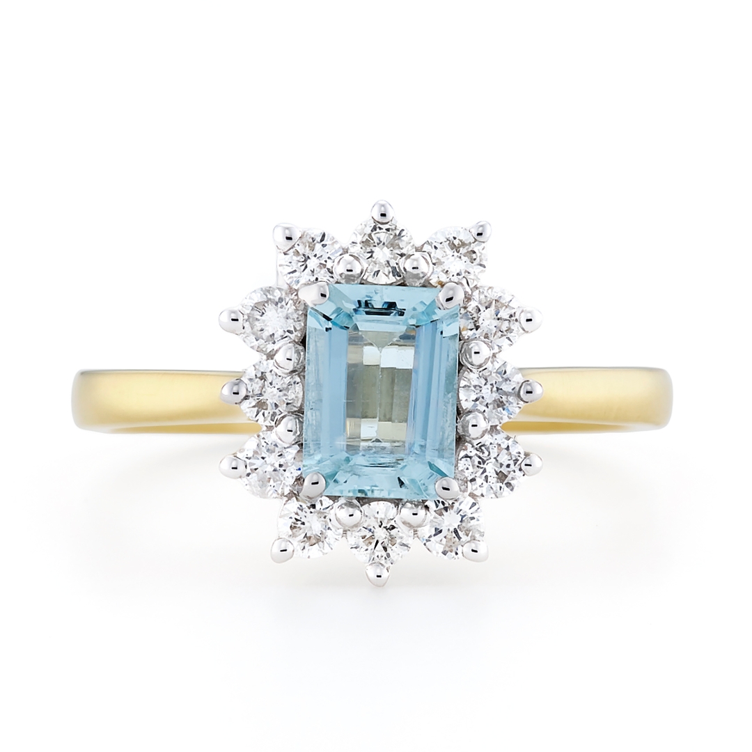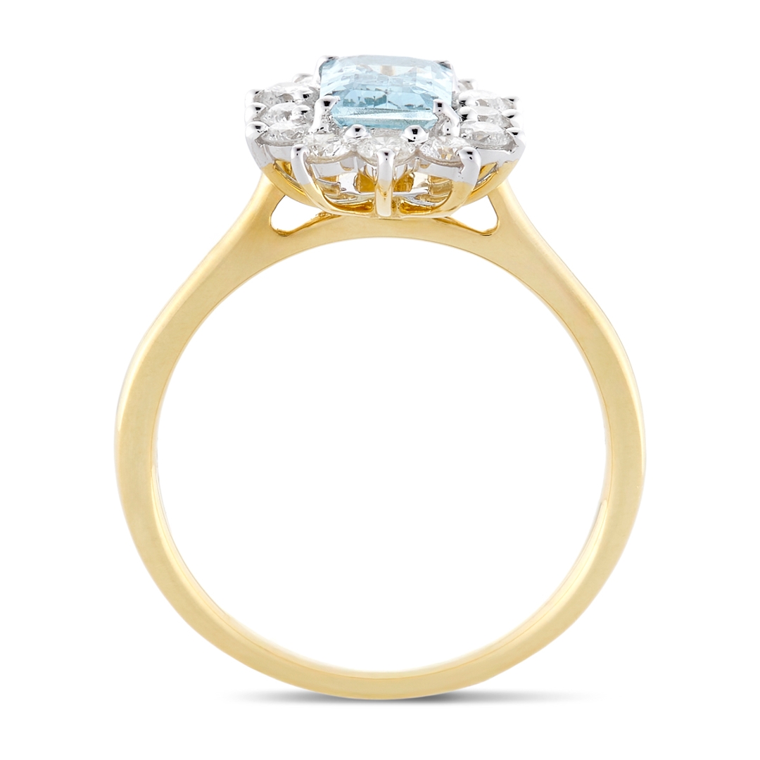 A brand new, unused, certified 18ct yellow & white gold natural diamond & aquamarine gemstone cluster ring, set with one octagonal step-cut aquamarine gemstone to the centre & twelve brilliant-cut diamonds in a halo setting.