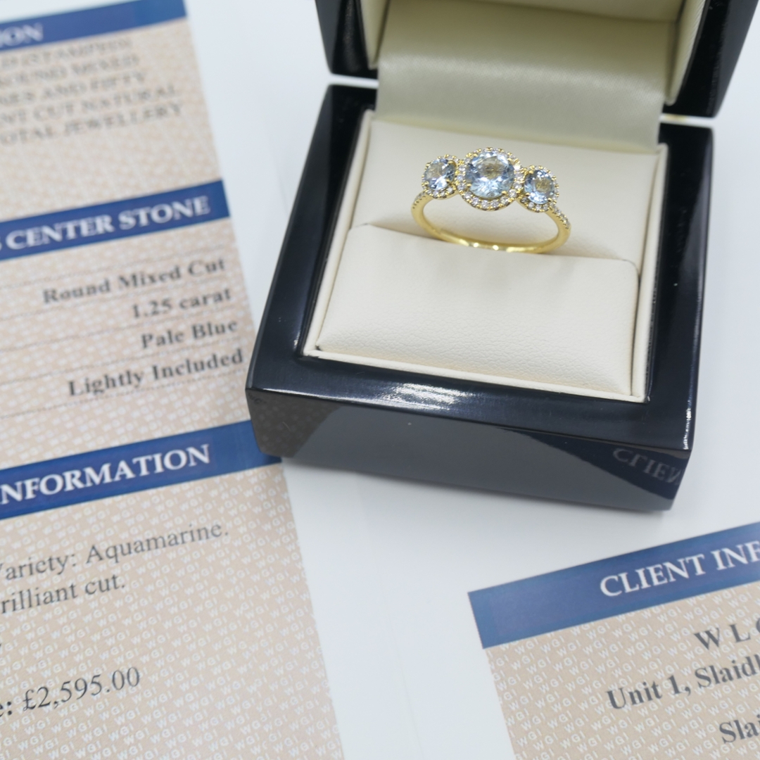 A brand-new, unused certified natural diamond and aquamarine trio cluster ring that radiates timeless elegance and refined charm. This exquisite piece features three round mixed-cut aquamarine gemstones, totalling 1.25ct, each displaying a delicate pale blue hue that evokes calm and clarity. Surrounding the centre stones and extending onto the shoulders are clusters of brilliant-cut natural diamonds, totalling 0.26ct, graded F–G in colour and SI1–SI2 in clarity. The diamonds add a captivating sparkle that beautifully enhances the aquamarines’ soft luminosity. Expertly crafted in 18ct yellow gold, the warm metal provides a luxurious contrast to the cool blue gemstones, highlighting their serene beauty. With a total weight of 3.04 grams and a professional valuation of £2,595, this ring exemplifies superb craftsmanship and elegant design.