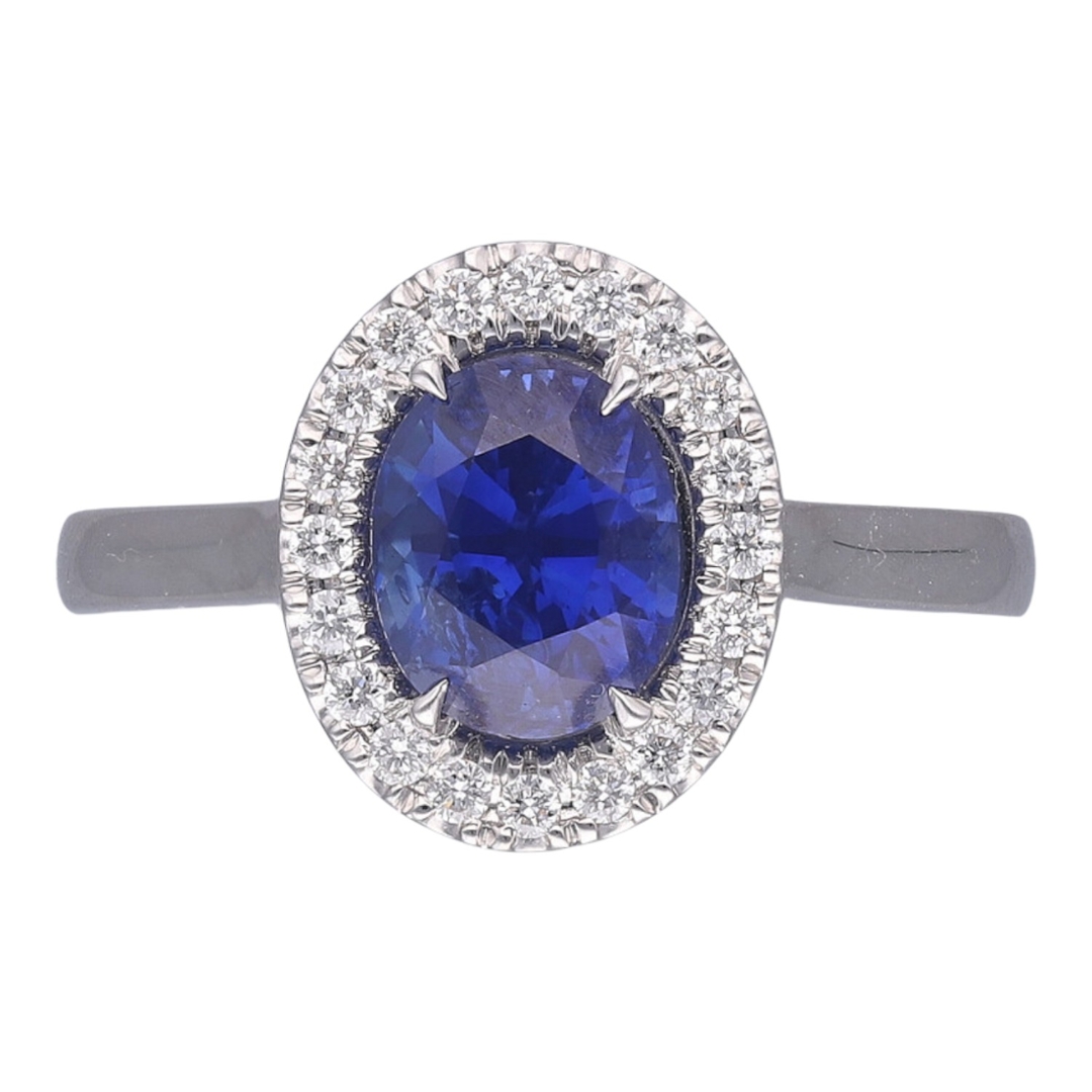 A brand-new, unused certified 18ct white gold cluster ring, showcasing a striking oval cut blue sapphire of 2.11ct at its centre, beautifully framed by a halo of brilliant cut natural diamonds weighing 0.20ct. The sapphire’s deep, vivid blue is enhanced by the brightness of the surrounding diamonds, creating a captivating contrast that highlights the design's elegance. The claw setting secures the sapphire while allowing maximum light to illuminate the gemstone, ensuring it radiates with intensity from every angle.