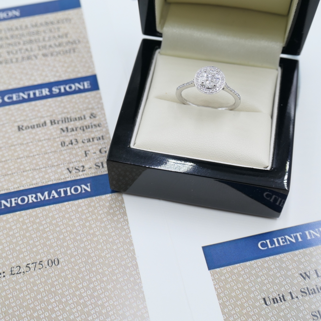 A brand-new, unused certified 18ct white gold cluster ring. Weighing 2.56 grams. This is an exquisite piece, set with a central arrangement of marquise and brilliant-cut natural diamonds, creating a striking play of shape and sparkle. With a total weight of 0.43ct, the stones are carefully matched in VS2–SI1 clarity and F–G colour, ensuring exceptional brightness and fire. The design is further enhanced by brilliant-cut diamonds adorning the shoulders, adding extra radiance and completing a look of refined elegance. The cool tone of white gold provides the perfect backdrop, amplifying the natural brilliance of each diamond.