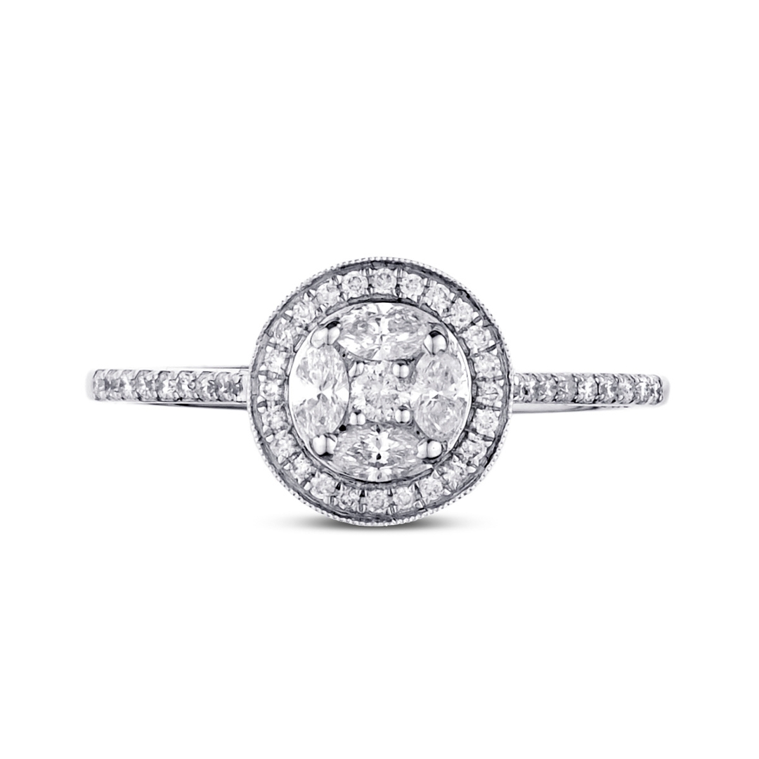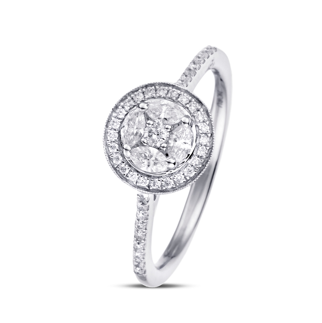 A brand-new, unused certified 18ct white gold cluster ring. That weighs 2.56 grams. This is an exquisite piece, set with a central arrangement of marquise and brilliant-cut natural diamonds, creating a striking play of shape and sparkle. With a total weight of 0.43ct, the stones are carefully matched in VS2–SI1 clarity and F–G colour, ensuring exceptional brightness and fire. The design is further enhanced by brilliant-cut diamonds adorning the shoulders, adding extra radiance and completing the refined elegance of the look. The cool tone of white gold provides the perfect backdrop, amplifying the natural brilliance of each diamond.