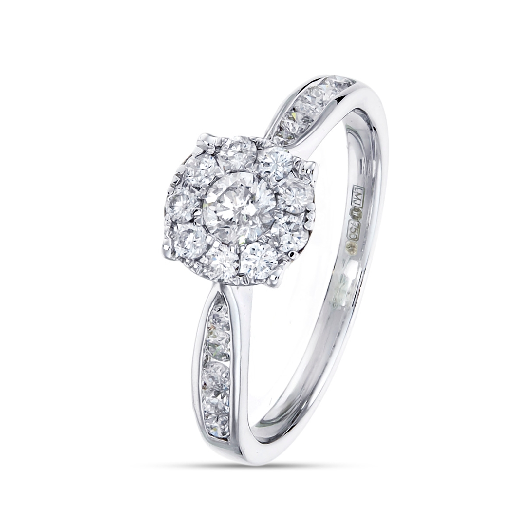 A brand-new, unused certified natural diamond cluster ring that perfectly blends brilliance, elegance, and craftsmanship. At its centre lies a 0.29-carat brilliant-cut natural diamond, graded G in colour and SI2 in clarity, radiating captivating sparkle and fire. Surrounding the centre stone is a halo of additional brilliant-cut diamonds, extending gracefully onto the shoulders and totalling 0.50 carats. Graded F–G in colour and SI1–SI2 in clarity, these diamonds intensify the ring’s radiance, creating a dazzling, light-filled display that celebrates both precision and luxury. Every stone has been expertly chosen for its quality and brilliance, ensuring a flawless harmony of sparkle.