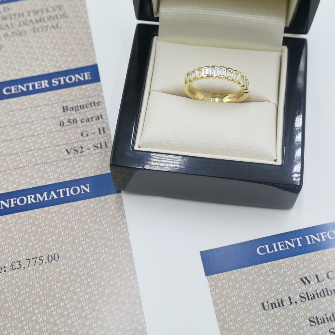 A brand-new, unused, certified 18ct yellow gold cluster ring, this graceful design is set with a striking cluster of natural baguette-cut diamonds that together total 0.50ct. Graded G-H in colour and VS2-SI1 in clarity, the stones have been selected for their bright sparkle and refined geometry, giving the piece both elegance and distinction. The rich glow of 18ct yellow gold provides a warm contrast to the clean lines of the baguette cuts, highlighting their brilliance while lending a timeless quality that ensures this ring will always remain in style. Its cluster setting delivers a bold, eye-catching finish, perfectly balancing sophistication with statement appeal.