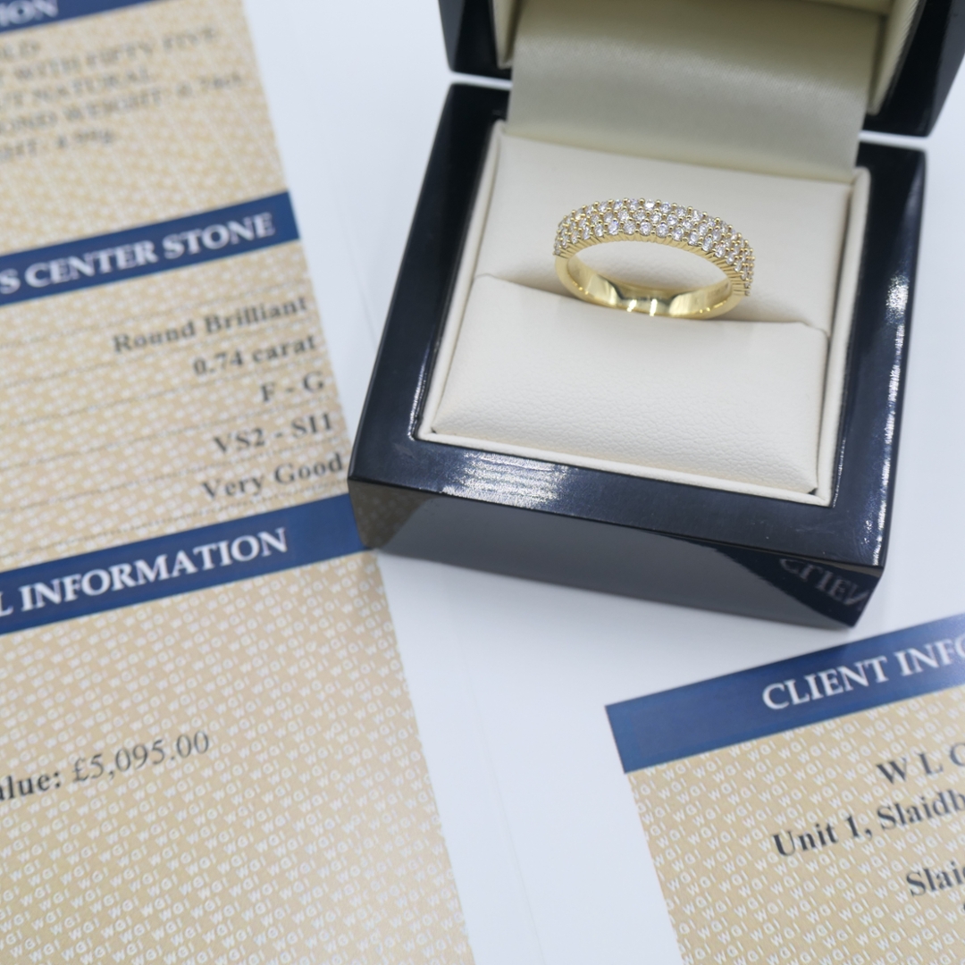 A brand-new, unused certified 18ct yellow gold cluster ring, finely set with a triple row of round brilliant-cut natural diamonds totalling 0.74ct. Each diamond, graded F–G in colour and VS2–SI1 in clarity, has been precisely selected to deliver exceptional fire and brilliance, beautifully enhanced by the warm glow of the yellow gold mount. The arrangement of fifty-five stones across the band creates an impressive display of radiance, making it a striking yet wearable piece for all occasions.