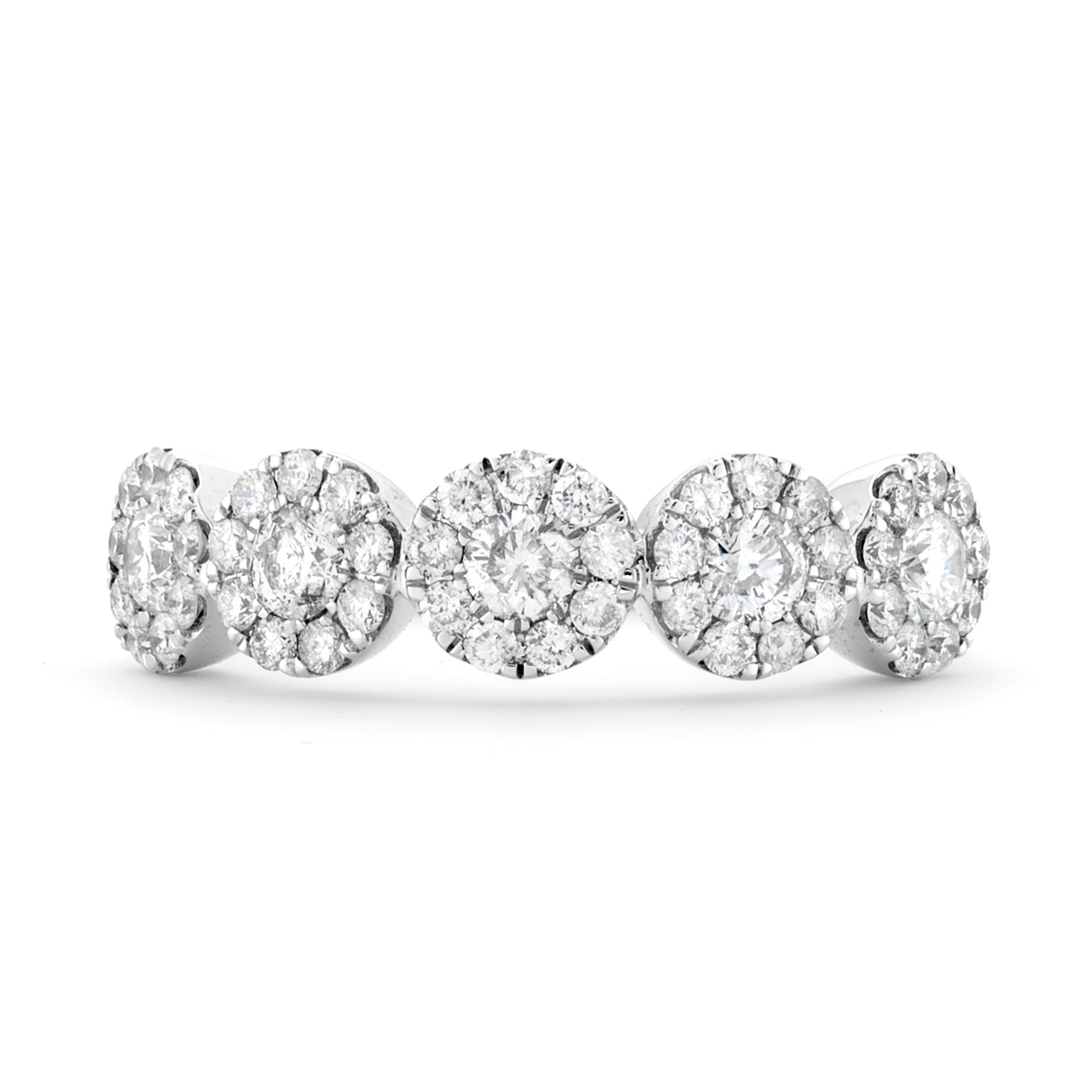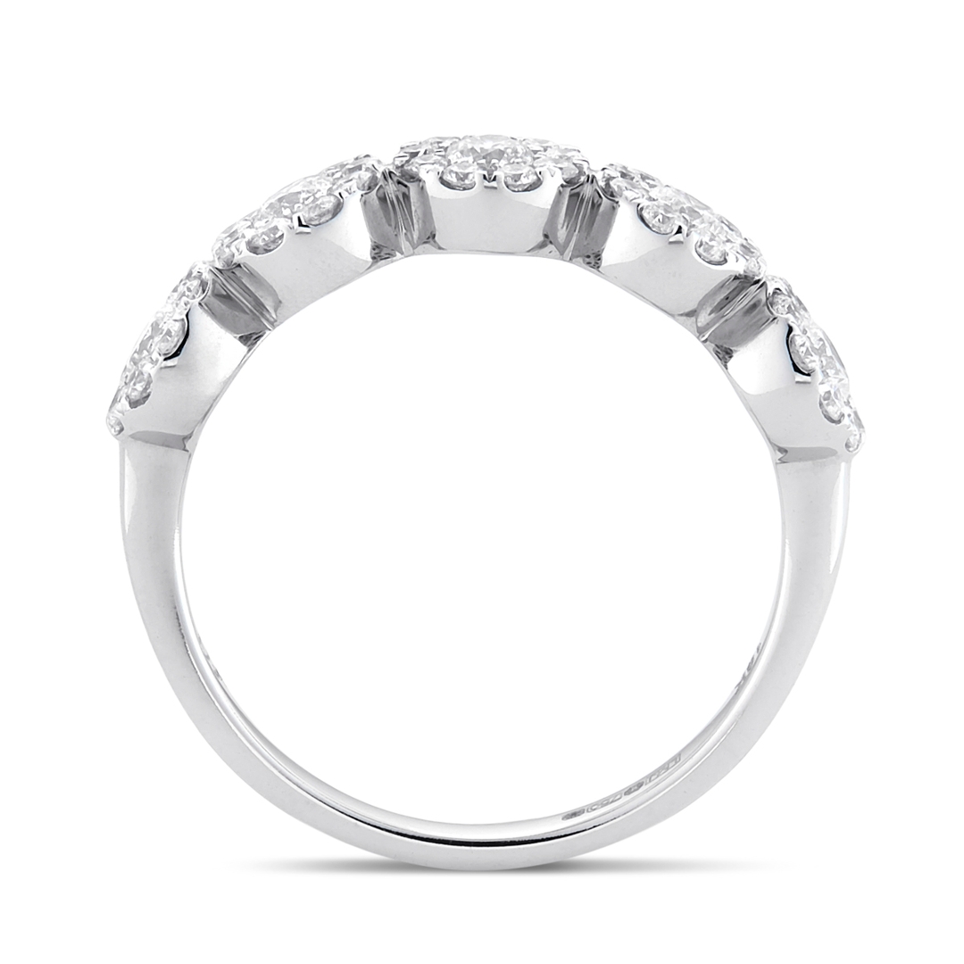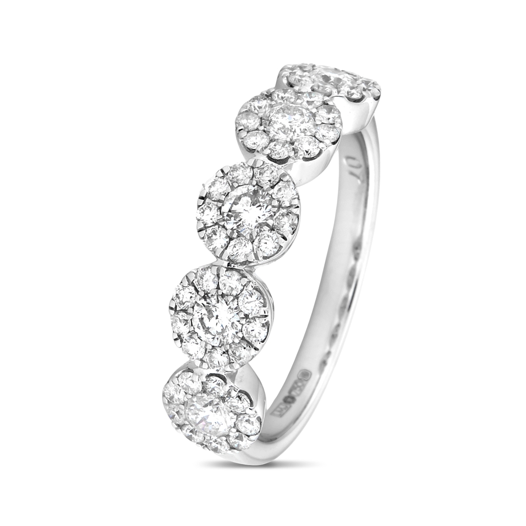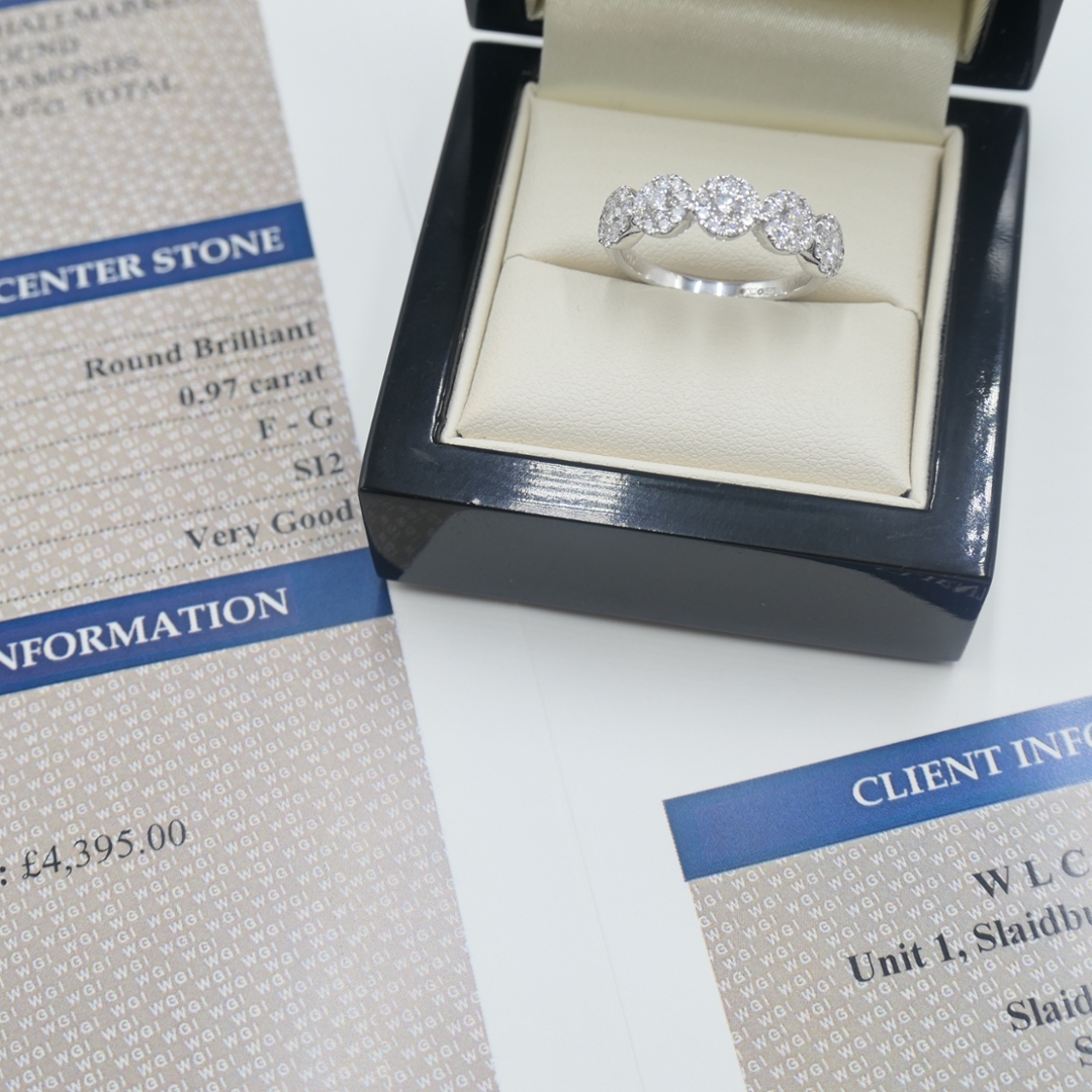 A brand-new, unused certified 18ct white gold cluster ring, this refined jewel is set with a central cluster of brilliant-cut natural diamonds weighing a total of 0.97ct. The stones, graded SI2 in clarity and F–G in colour, have been carefully selected for their brightness and fire, creating a lively display of sparkle. The clean, cool tones of white gold provide the perfect backdrop to amplify the diamonds' brilliance, resulting in a design that is both elegant and timeless. With its balanced proportions and near-carat weight, this ring is crafted to impress while remaining versatile and wearable.