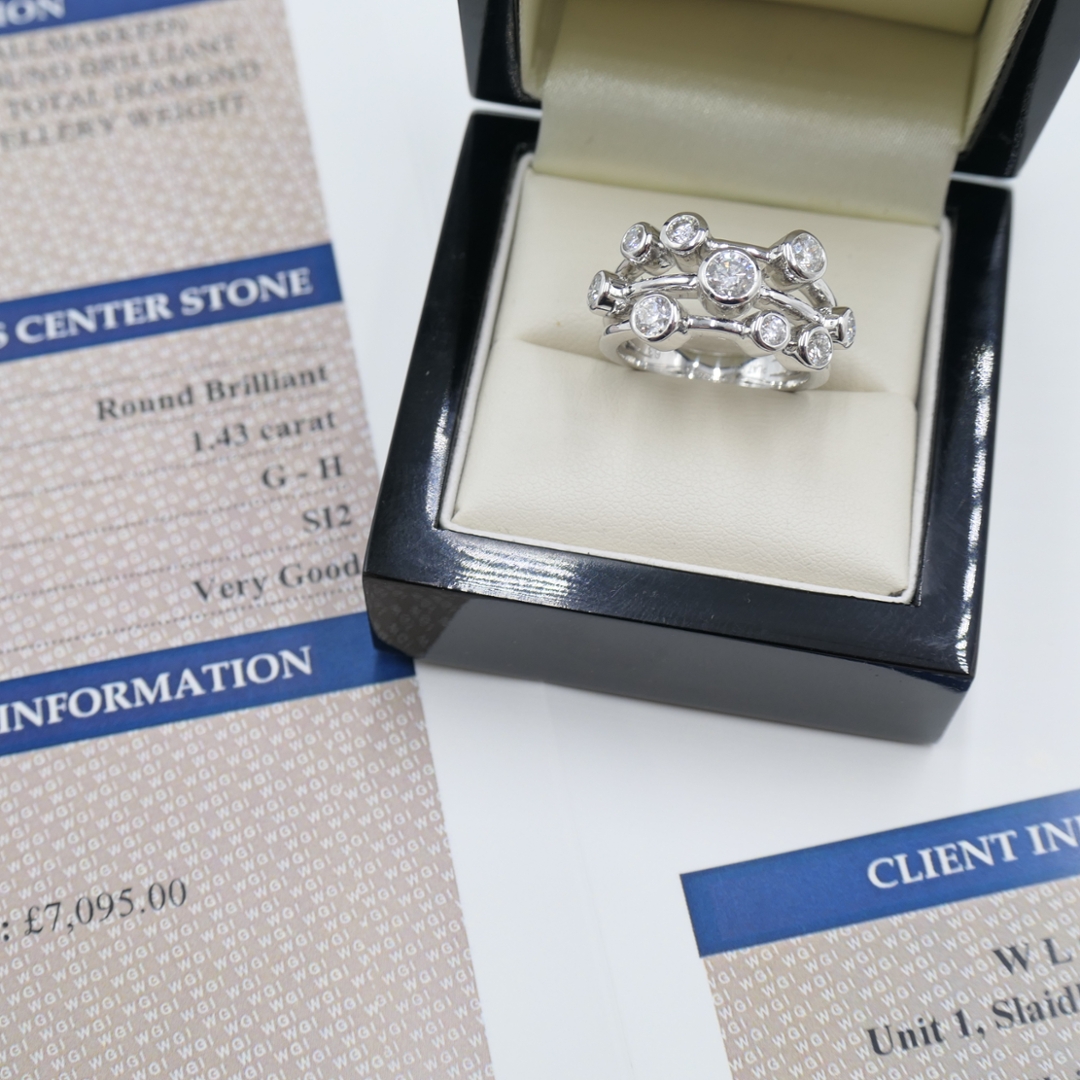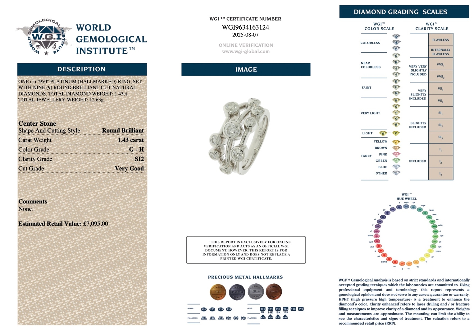 A brand-new, unused, certified 18ct yellow gold cluster ring, this striking jewel is set with nine brilliant-cut natural diamonds weighing a total of 1.43 carats. Graded SI2 in clarity and G–H in colour, the stones are carefully arranged to create a harmonious cluster, producing a lively sparkle that radiates from every angle. The rich yellow gold enhances the diamonds' natural fire, giving the design a luxurious warmth and timeless character. With its balanced proportions and impressive presence, this ring is a refined piece that combines elegance with enduring style, perfect for those who appreciate classic fine jewellery.