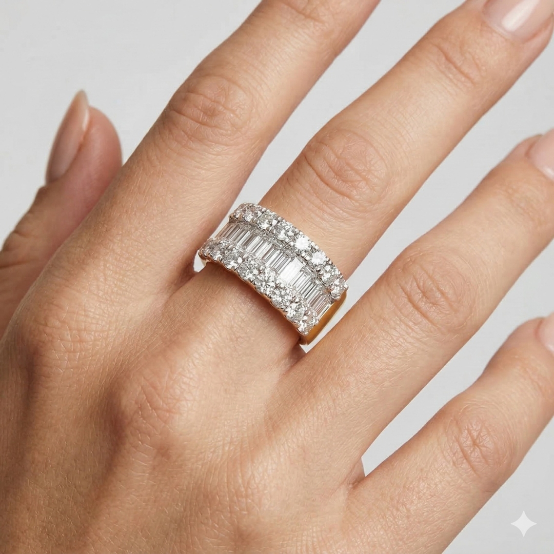 A brand-new, unused certified 18ct yellow and white gold cluster ring, this impressive jewel is set with a striking combination of brilliant-cut and baguette-cut natural diamonds weighing a total of 2.88ct. Weighing 10.34 grams. Carefully matched in SI2 clarity and G–H colour, the diamonds create a bold arrangement that captures the light from every angle, blending sparkle with sleek geometry. The contrast of yellow and white gold enhances the play of brilliance and fire, offering both warmth and brightness in a design that is substantial yet refined. With its generous carat weight and distinctive styling, this ring is crafted to make a statement of elegance and luxury.