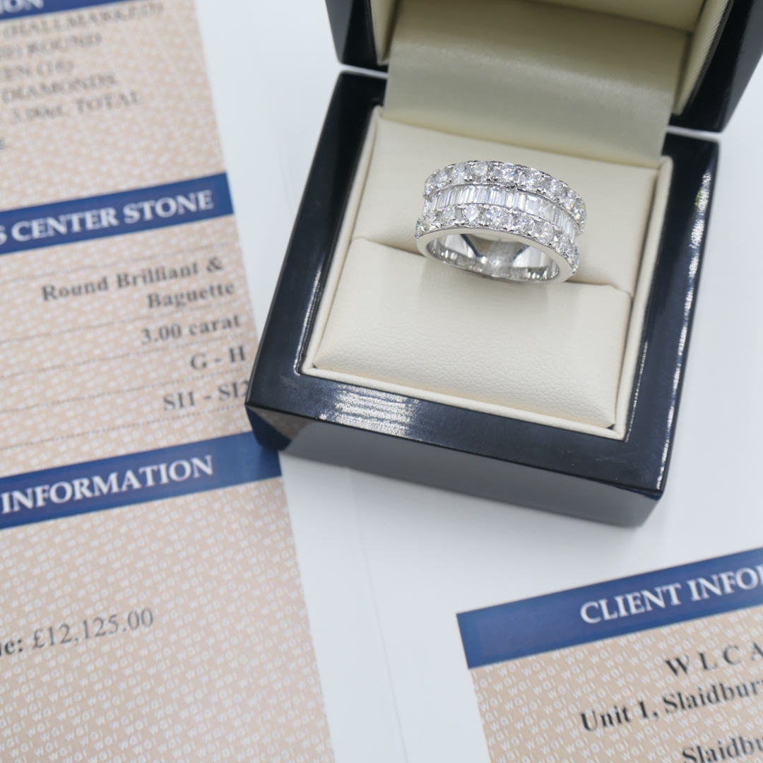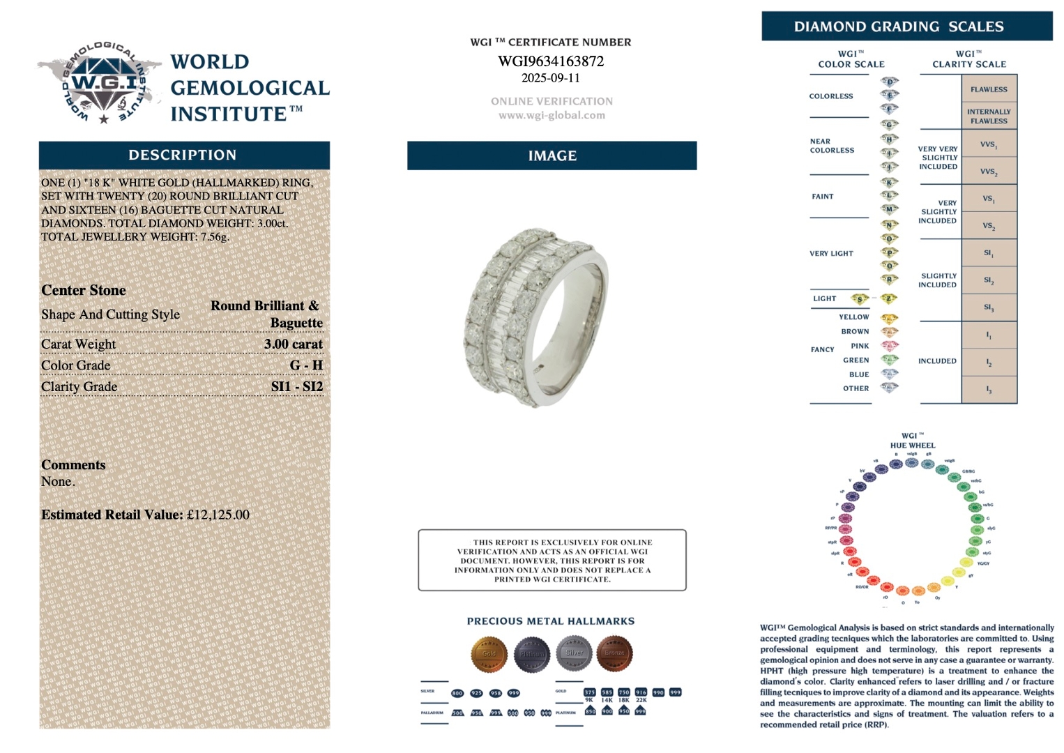 A brand-new, unused certified 18ct white gold diamond cluster ring that makes a bold and luxurious statement. This impressive piece is set with an array of natural diamonds, combining both baguette cuts and brilliant cuts to create a striking display of fire and sparkle. With a total diamond weight of 3.00 carats, graded G-H in colour and SI1-SI2 in clarity, the ring showcases bright, lively stones that exude radiance from every angle. The substantial white gold setting not only enhances the diamonds' brightness but also adds strength and durability, making it a lasting piece of fine jewellery.