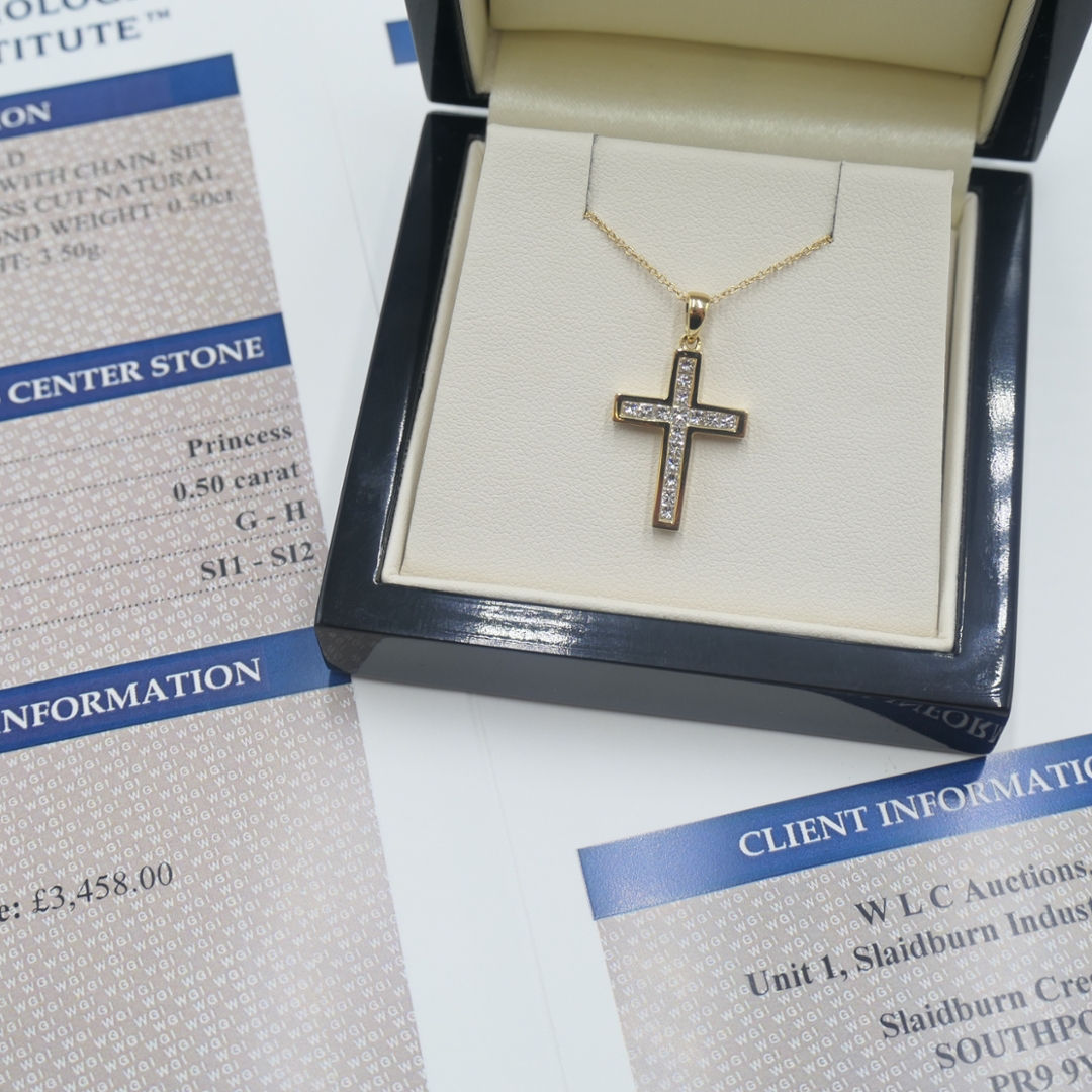 A brand-new, unused, certified 18ct yellow gold cross pendant, beautifully crafted and set with a cluster of natural princess-cut diamonds totalling 0.50ct. Each diamond has been expertly selected for its SI1–SI2 clarity and G–H colour, resulting in a refined brilliance that contrasts elegantly with the rich warmth of the yellow gold setting. Contemporary princess cuts add a sharp, clean sparkle to the classic cross design, offering a modern yet timeless appeal. Paired with an 18-inch yellow gold chain, this pendant sits gracefully at the neckline, making it an effortlessly elegant piece for daily wear or special occasions.