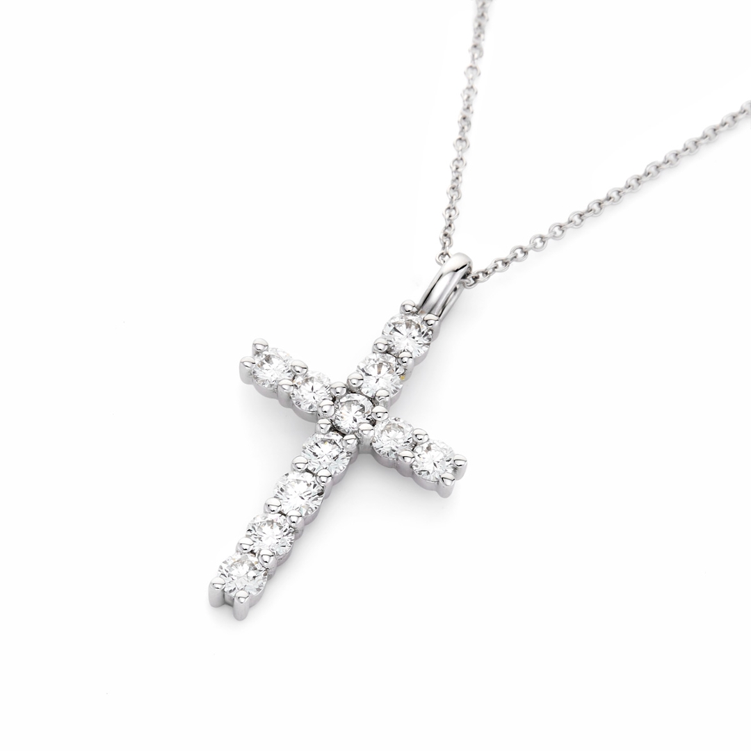The 18ct white gold setting provides a sleek, contemporary backdrop that enhances the fire and brilliance of the diamonds, while the classic cross design offers a timeless and meaningful silhouette. Whether worn as a symbol of faith or admired for its graceful beauty, this pendant makes a powerful yet understated statement.