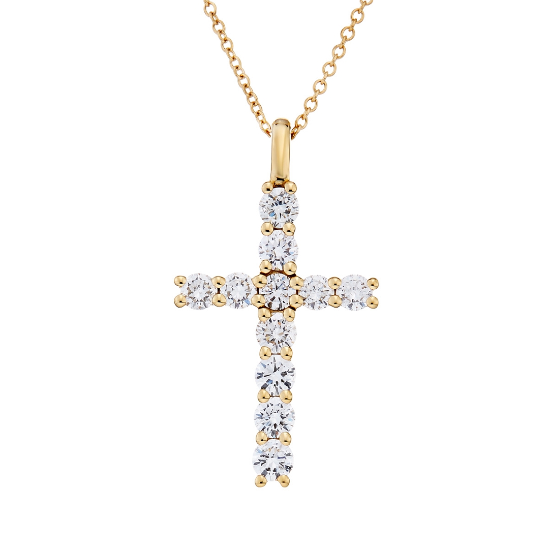 A brand-new, unused, certified natural diamond cross pendant, set with a cluster of brilliant-cut diamonds, set in 18ct yellow gold.