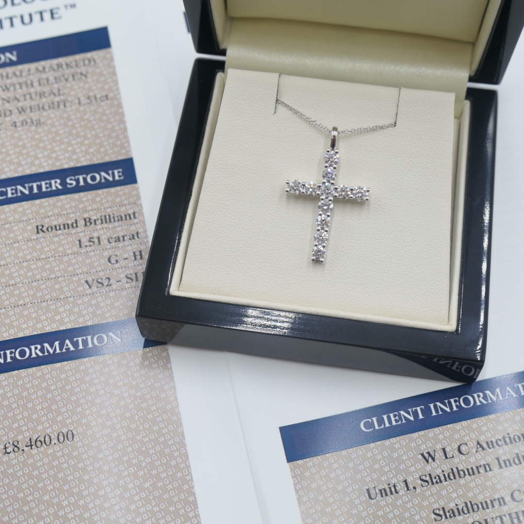A brand-new, unused, certified 18ct white gold natural diamond cross pendant that captures the essence of elegance, meaning, and radiant luxury. This exquisite piece is set with a stunning cluster of brilliant-cut natural diamonds, totalling 1.51 carats. Graded VS2–SI1 for clarity and G–H in colour, each diamond has been carefully chosen for its exceptional sparkle, clarity, and balanced brilliance, ensuring an eye-catching display from every angle.