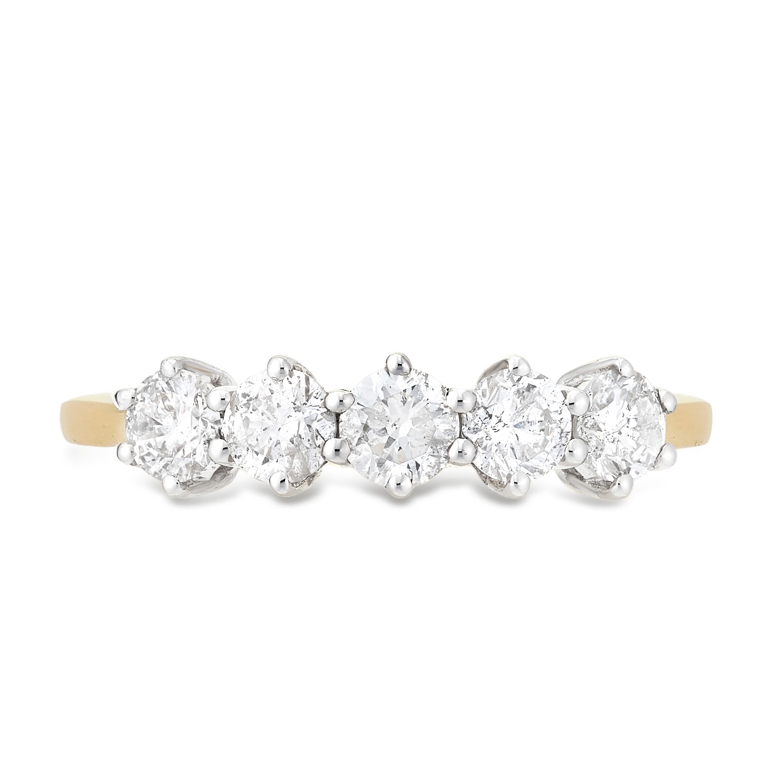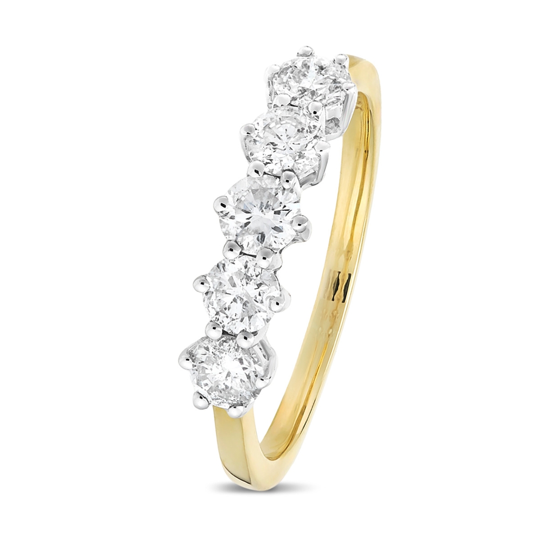 A brand-new, unused 18ct yellow and white gold five stone eternity ring, beautifully set with natural round brilliant-cut diamonds totalling 0.97 carat. The stones are graded G–H in colour and SI1–SI2 in clarity, offering a lively sparkle with a bright, near-colourless hue that complements the classic design. Each diamond has been carefully selected for its radiance and is securely mounted in white gold, while the band is crafted in yellow gold, providing a warm, elegant contrast. The combination creates a timeless look, ideal for marking life’s milestones or as a luxurious everyday piece.