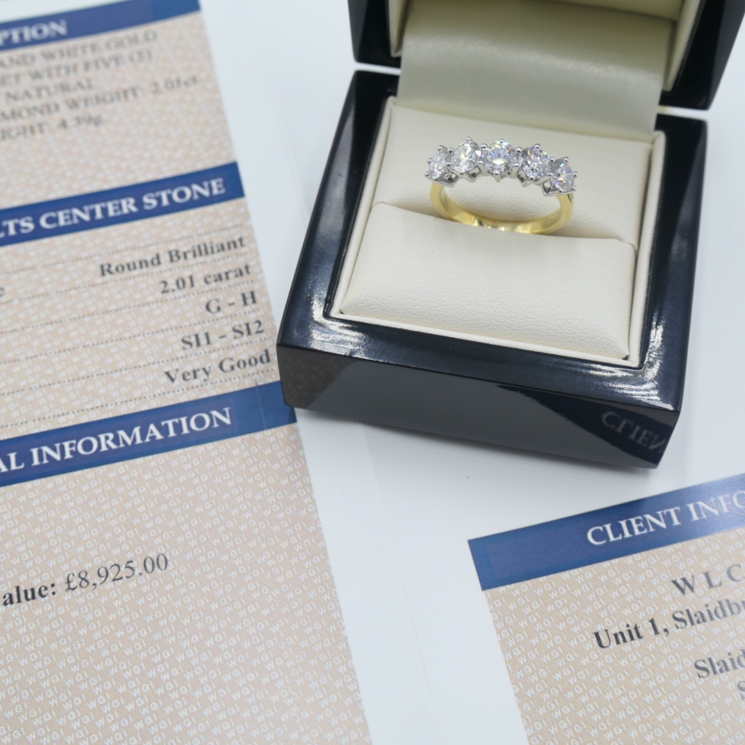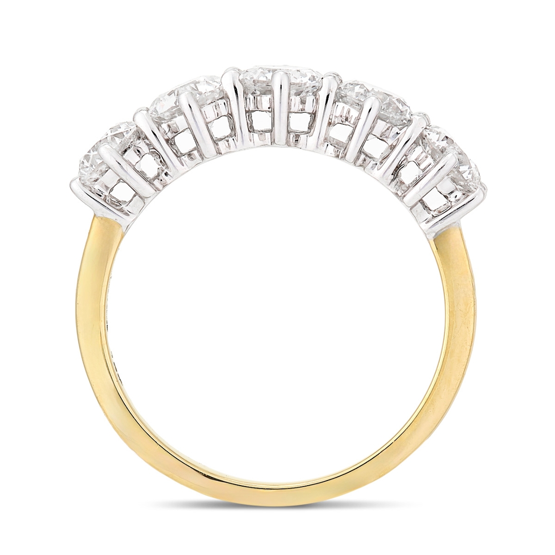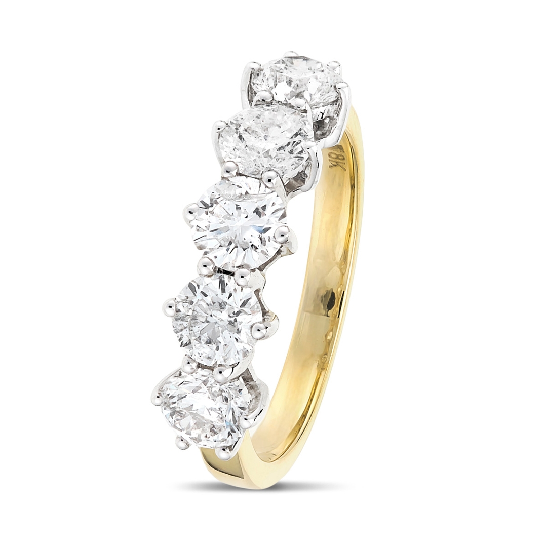 A brand-new, unused 18ct yellow and white gold five-stone eternity ring, set with natural diamonds that offer timeless brilliance and elegance. The ring is finely mounted with five round brilliant-cut stones, carefully selected for their sparkle and symmetry, totalling 2.01 carats. With a colour grade of G–H and clarity of SI1–SI2, each diamond displays bright fire and lively character, emphasised by a secure white gold setting that enhances their natural radiance. The contrast with the yellow gold shank adds warmth and classic appeal, making this ring a versatile piece suitable for both daily wear and special occasions.