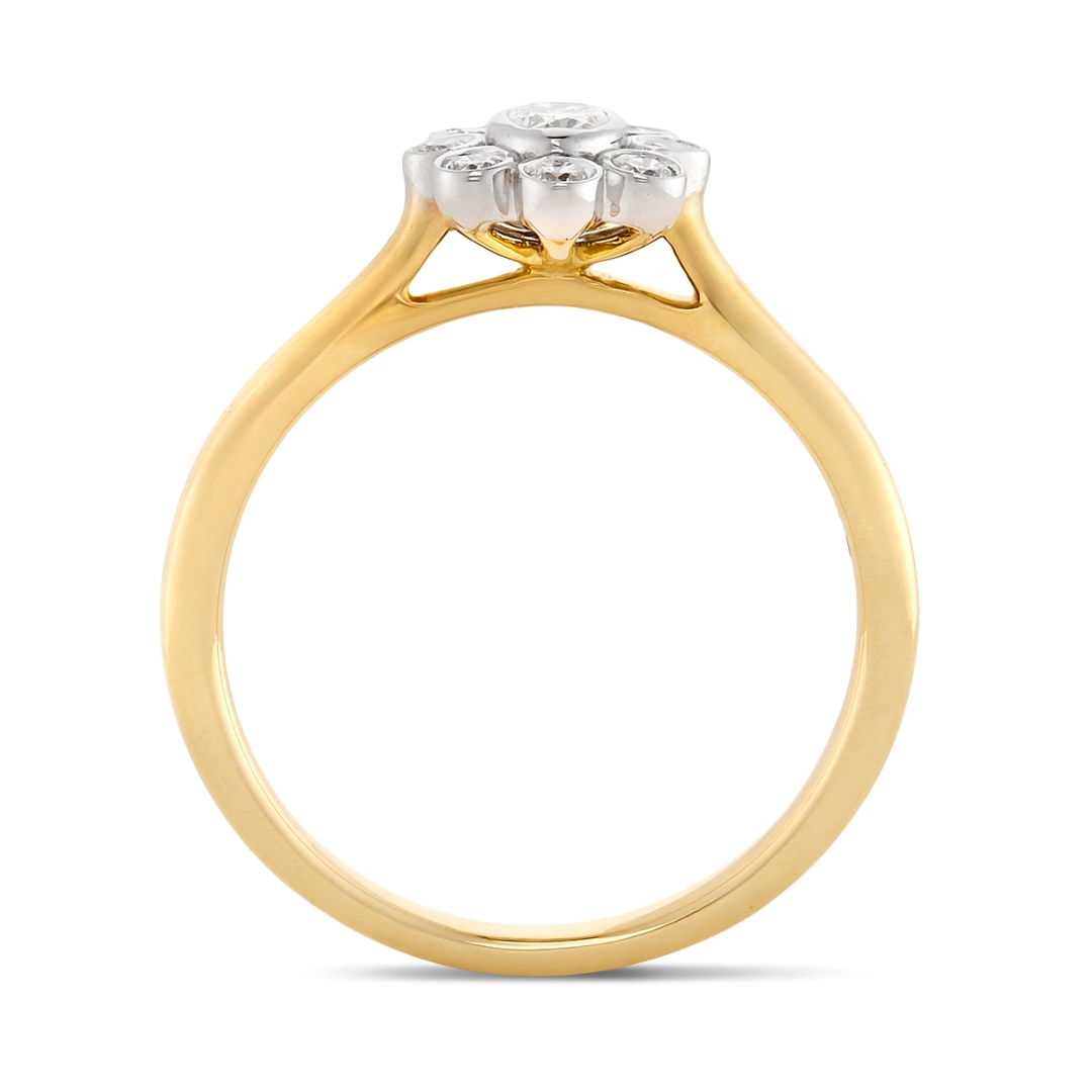 A brand-new, unused 18ct yellow and white gold natural diamond flower-shaped cluster ring, designed with a central oval-cut diamond surrounded by eight brilliant-cut stones arranged in a halo to form a delicate floral silhouette. The total diamond weight is 0.35 carat, with a G–H colour grade and SI1–SI2 clarity, ensuring a bright, lively sparkle that beautifully contrasts against the yellow gold band. The white gold setting around the stones enhances their brilliance, while the elegant, timeless design makes this piece versatile for both everyday wear and special occasions. Weighing 3.53g, it carries a comfortable yet substantial presence on the hand.