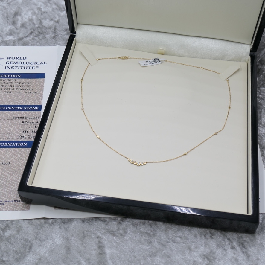 A brand-new, unused, certified 18ct yellow gold natural diamond chain necklace that blends refined elegance with a delicate touch of sparkle. Expertly crafted, this graceful piece is set with a tasteful cluster of brilliant-cut natural diamonds, totalling 0.24 carats in weight. The diamonds, graded SI1–SI2 in clarity and F–G in colour, have been carefully selected for their bright, lively appearance and delicate balance of clarity and brilliance.