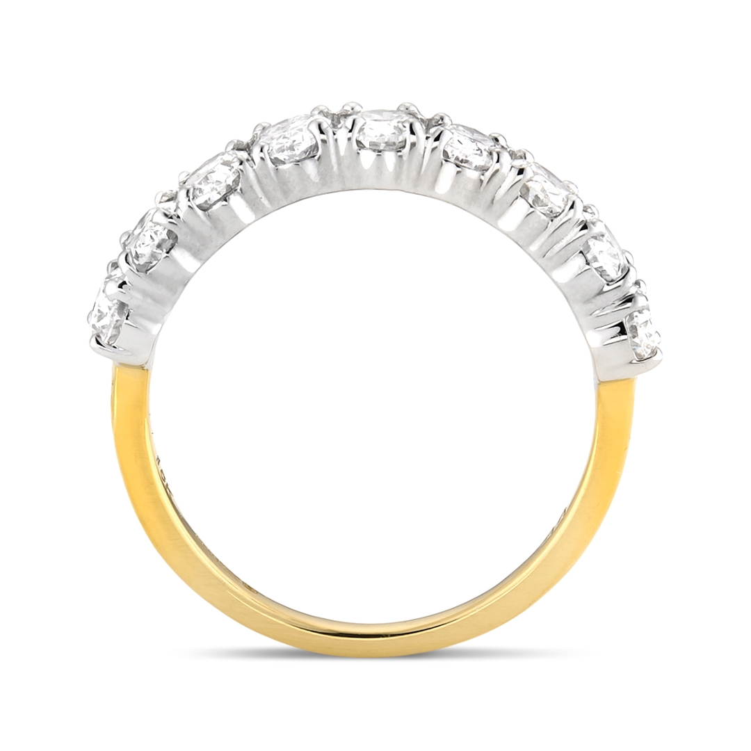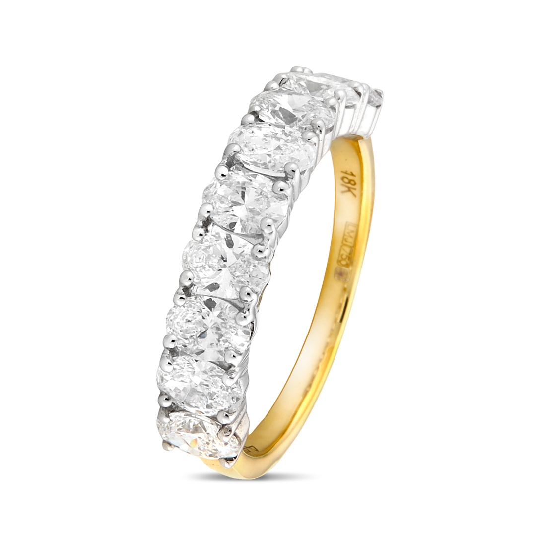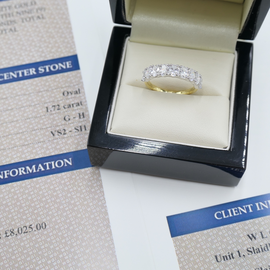A brand-new, unused, certified 18ct yellow and white gold nine-stone eternity ring, this beautifully crafted piece is set with nine oval-cut natural diamonds totalling 1.72ct. Each diamond, graded between VS2 and SI1 in clarity and G–H in colour, has been selected for its balance of fire and brilliance, ensuring a consistent sparkle across the band. The oval cut brings an elegant elongation to the stones, creating a refined sense of movement and light. The combination of warm yellow gold with bright white gold offers both contrast and harmony, allowing the natural beauty of the diamonds to shine through in a setting that is timeless and sophisticated.