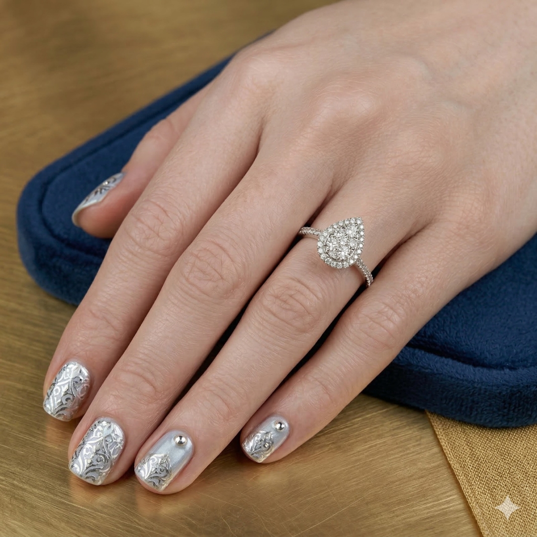A brand-new, unused, certified natural diamond pear-shaped cluster ring that captures timeless elegance and refined brilliance. At its centre, a cluster of brilliant-cut diamonds forms a graceful pear-shaped design, radiating with extraordinary sparkle and depth. The combined diamond weight of 1.06 carats, graded G–H in colour and SI2 in clarity, ensures an exceptional display of natural fire and light. Each diamond has been carefully selected for its brilliance and harmony, creating a stunning composition that reflects the purity and beauty only natural diamonds possess — treasured for their authenticity, rarity, and enduring allure.