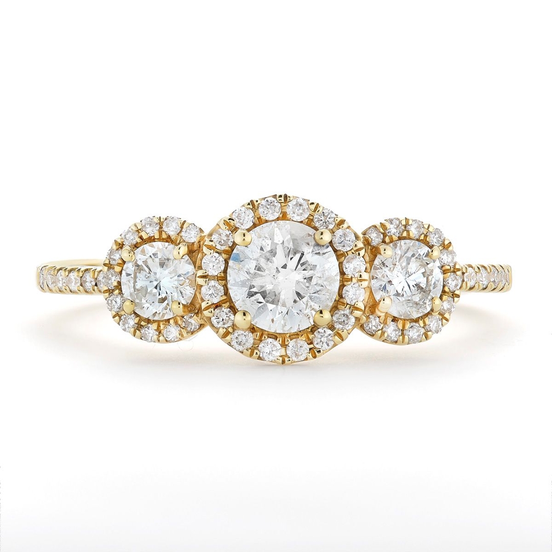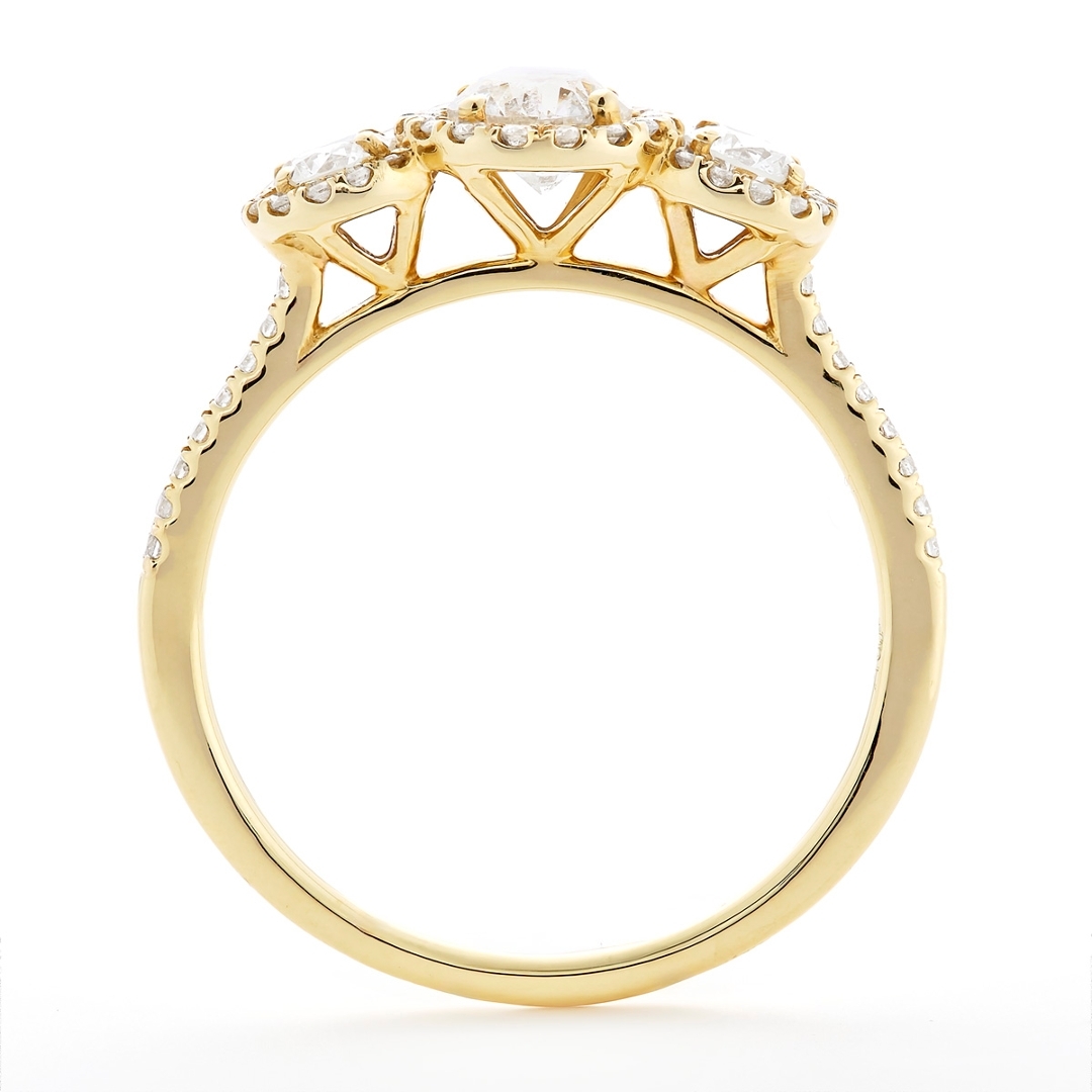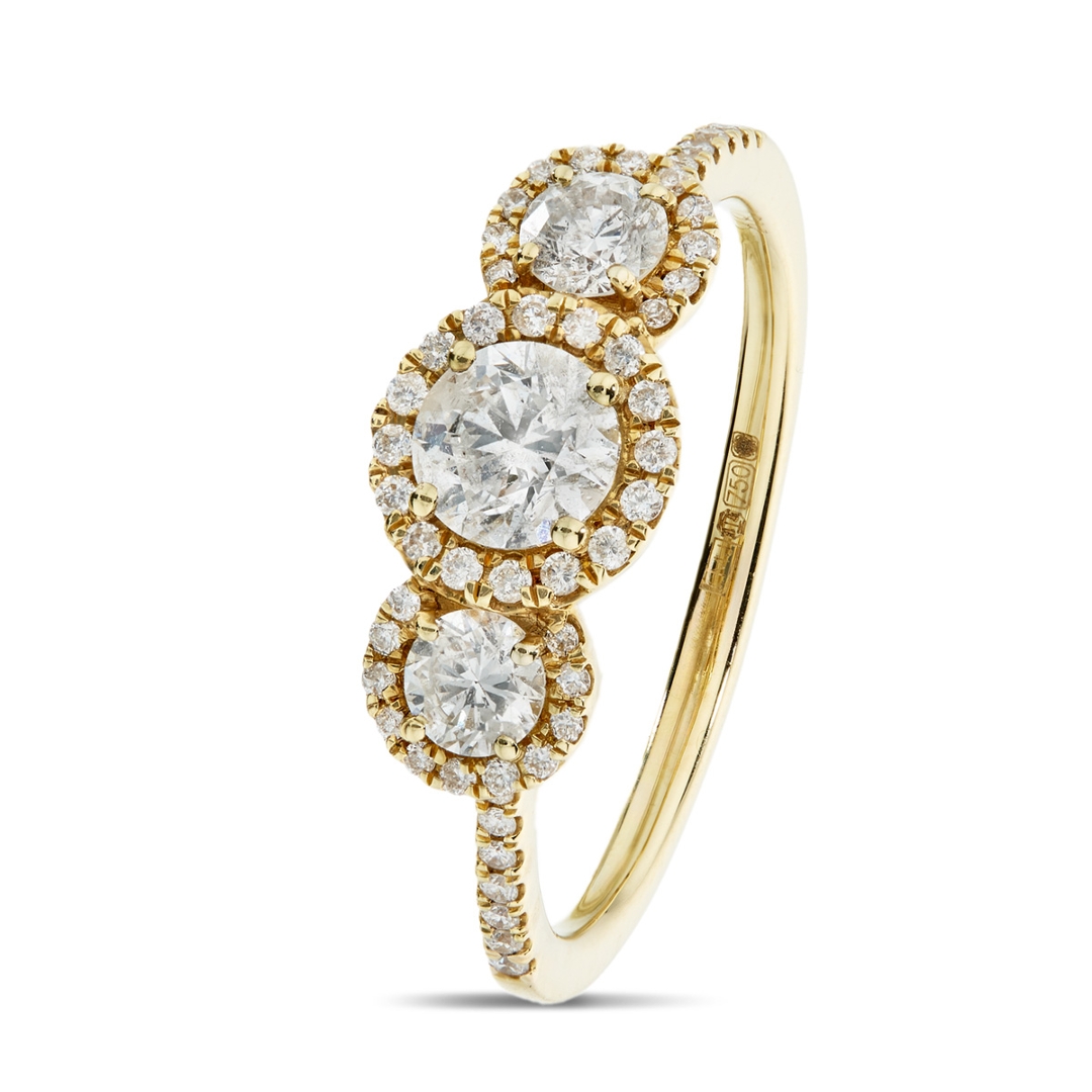A brand-new, unused, certified 18ct yellow gold natural diamond round-shaped trio cluster ring, set with three brilliant cut diamonds to the centre & a cluster of brilliant-cut diamonds in a halo setting & to the shoulders.