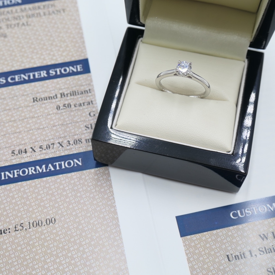 A brand-new, unused platinum solitaire engagement ring, certified and set with a dazzling natural diamond that radiates classic beauty. A 0.50ct brilliant-cut diamond is at the centre, carefully selected for its exceptional sparkle and enduring charm. Graded G for colour and SI1 for clarity, this stone offers crisp, near-colourless brilliance with minimal inclusions visible only under magnification, ensuring a bright, lively presence that catches the light from every angle.