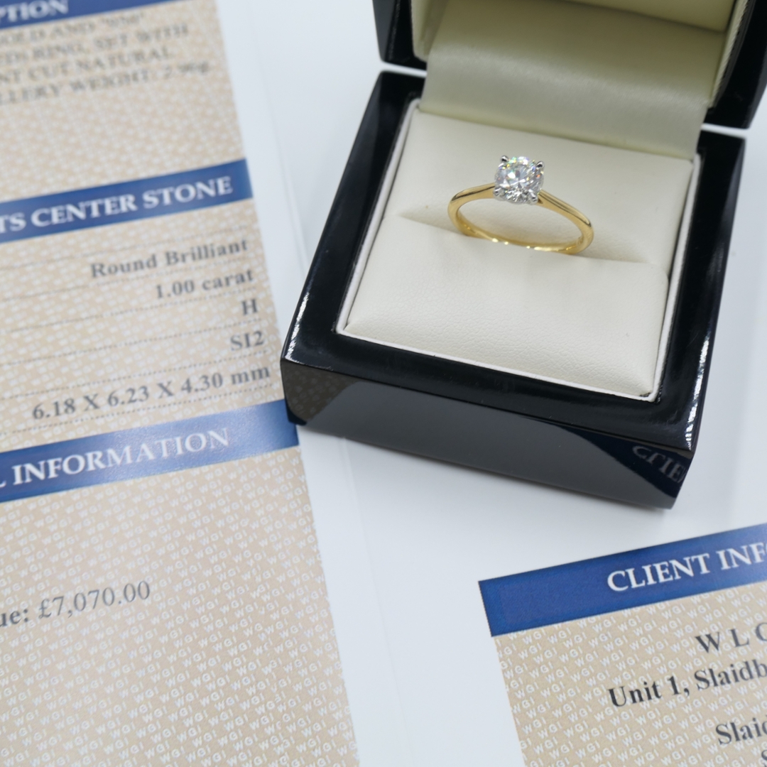 A brand-new, unused, certified platinum and 18ct yellow gold natural diamond solitaire engagement ring that captures both elegance and sentiment. At its centre, a 1.00ct brilliant-cut diamond shines, chosen for its radiant sparkle and lively character. With a clarity of SI2 and a colour grade of H, the stone delivers a beautiful play of light, combining brilliance with warmth. As a natural diamond, it embodies rarity and authenticity, making it especially meaningful and reflecting love in its purest form.