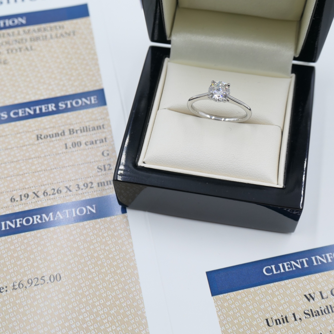 A brand-new, unused, certified platinum natural diamond solitaire engagement ring that represents love, devotion, and timeless elegance. At the centre is a 1.00ct brilliant-cut diamond, carefully selected for its radiant sparkle and natural charm. With a clarity grade of SI2 and a colour grade of G, the diamond exhibits lively brilliance that captures light beautifully. Its authenticity as a natural diamond ensures both rarity and significance, making it a symbol of true love and lasting commitment.