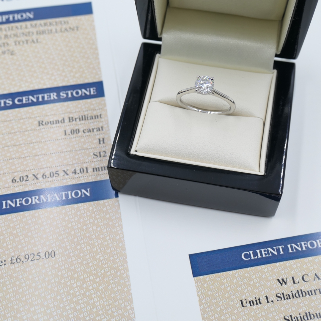 A brand-new, unused, certified platinum natural diamond solitaire engagement ring that embodies simplicity, elegance, and enduring value. At its centre sits a 1.00ct brilliant cut diamond, carefully selected for its captivating sparkle and timeless appeal. With a clarity of SI2 and a colour grade of H, the stone displays lively brilliance and warmth, ensuring it stands out without sacrificing the understated charm that makes solitaire designs so desirable. Its natural origin enhances its authenticity, rarity, and long-term significance.