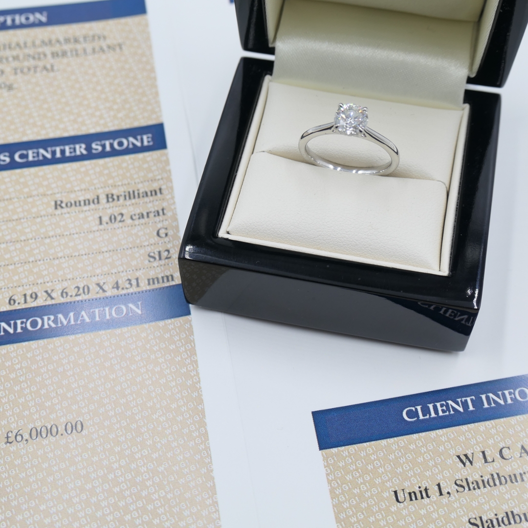 A brand-new, unused, certified platinum natural diamond solitaire engagement ring that captures elegance in its purest form. At the centre sits a 1.02ct brilliant cut diamond, carefully selected for its radiant sparkle and timeless appeal. With a clarity grade of SI2 and a colour grade of G, the diamond presents an attractive balance of brightness and character, making it both captivating and wearable. Its natural origin ensures authenticity and rarity, enhancing the ring’s significance.