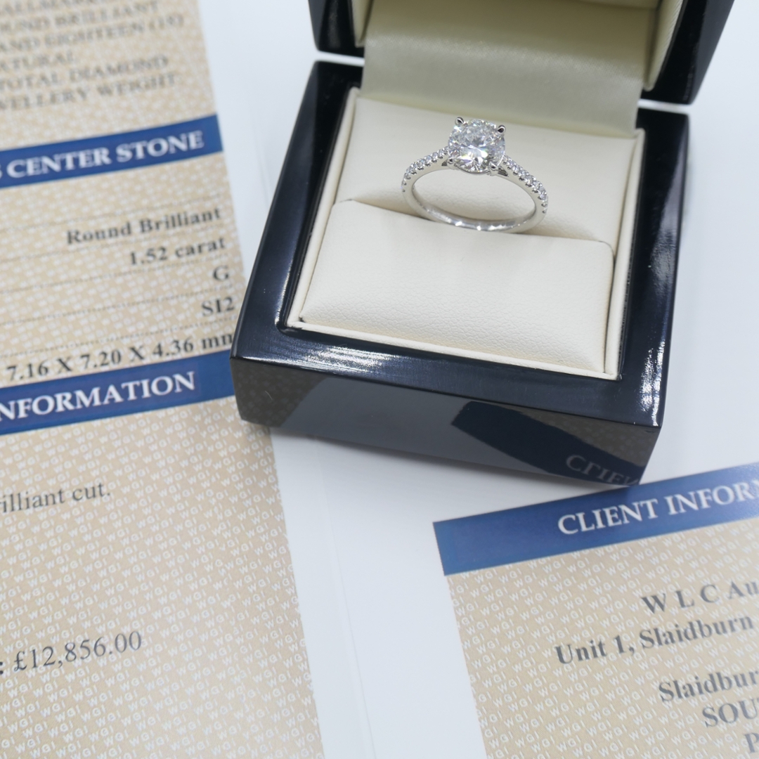 A brand-new, unused certified natural diamond solitaire engagement ring that beautifully captures timeless romance and refined luxury. At its heart lies a magnificent 1.52-carat brilliant-cut natural diamond, graded G in colour and SI2 in clarity, radiating exceptional fire and brilliance. The centre diamond is perfectly complemented by a cluster of brilliant-cut shoulder diamonds, totalling 0.23 carats and graded G–H in colour with VS2–SI1 clarity. Together, they create a captivating harmony of sparkle and light, celebrating the purity and allure of natural diamonds. Each diamond has been expertly selected to enhance both brilliance and balance, resulting in a truly elegant design.