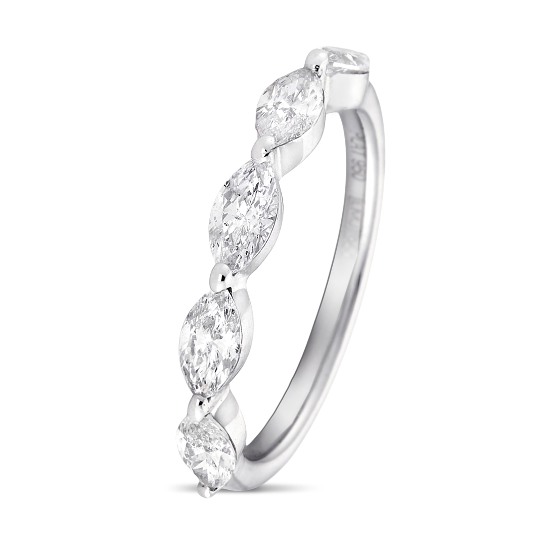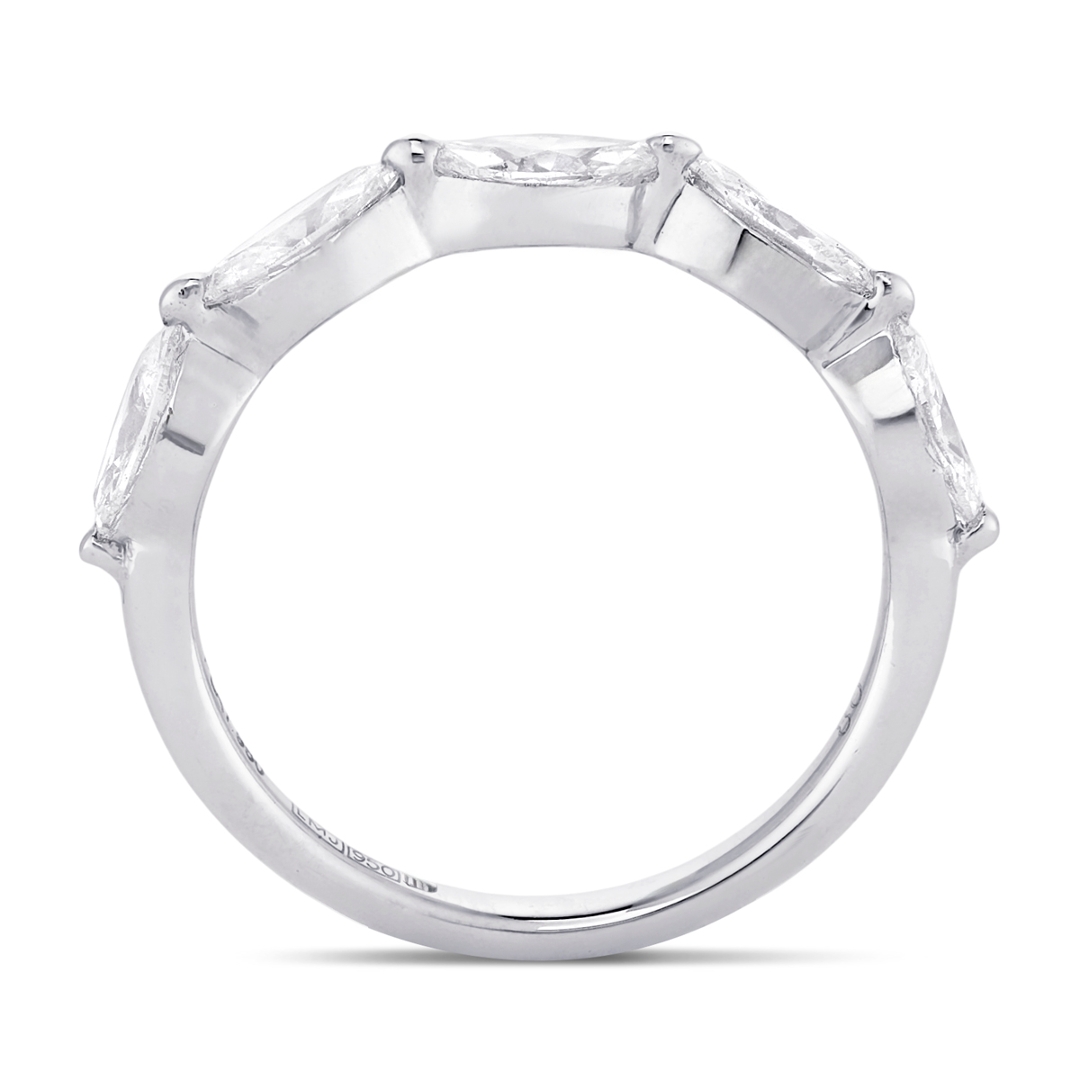A brand-new, unused platinum natural diamond wedding ring, beautifully crafted and set with five marquise-cut natural diamonds. The design totals 0.96 carat in diamond weight, graded F–G in colour and SI1–SI2 in clarity, ensuring a bright, near-colourless brilliance with elegant fire. The marquise cut, admired for its elongated shape and graceful symmetry, creates a refined and distinctive look, while the platinum mount enhances the diamonds’ natural radiance with strength and enduring lustre. With a total weight of 2.98g, this ring is both substantial and refined, offering timeless appeal as a wedding or anniversary band.