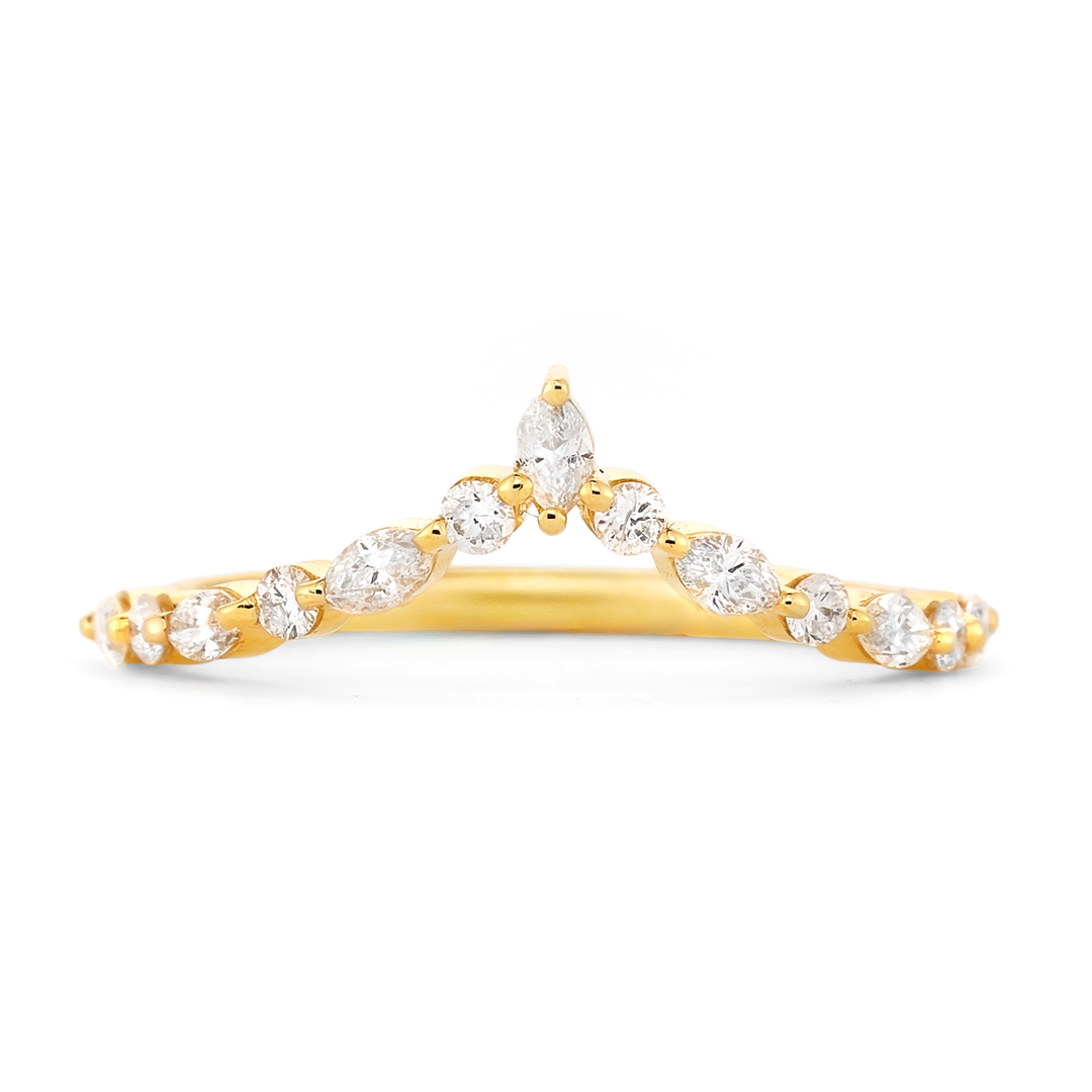A brand-new, unused 18ct yellow gold natural diamond wishbone eternity ring, designed with elegance and unique character. The band is beautifully set with a combination of seven marquise-cut diamonds and six round brilliant-cut diamonds, totalling 0.37 carats. The stones are graded F–G in colour and VS2–SI1 in clarity, offering a bright, near-colourless sparkle that enhances the distinctive wishbone shape. Crafted in rich yellow gold with a total weight of 1.79g, the ring has a refined yet eye-catching presence, making it ideal as a wedding or anniversary ring, or as a striking addition to any fine jewellery collection.