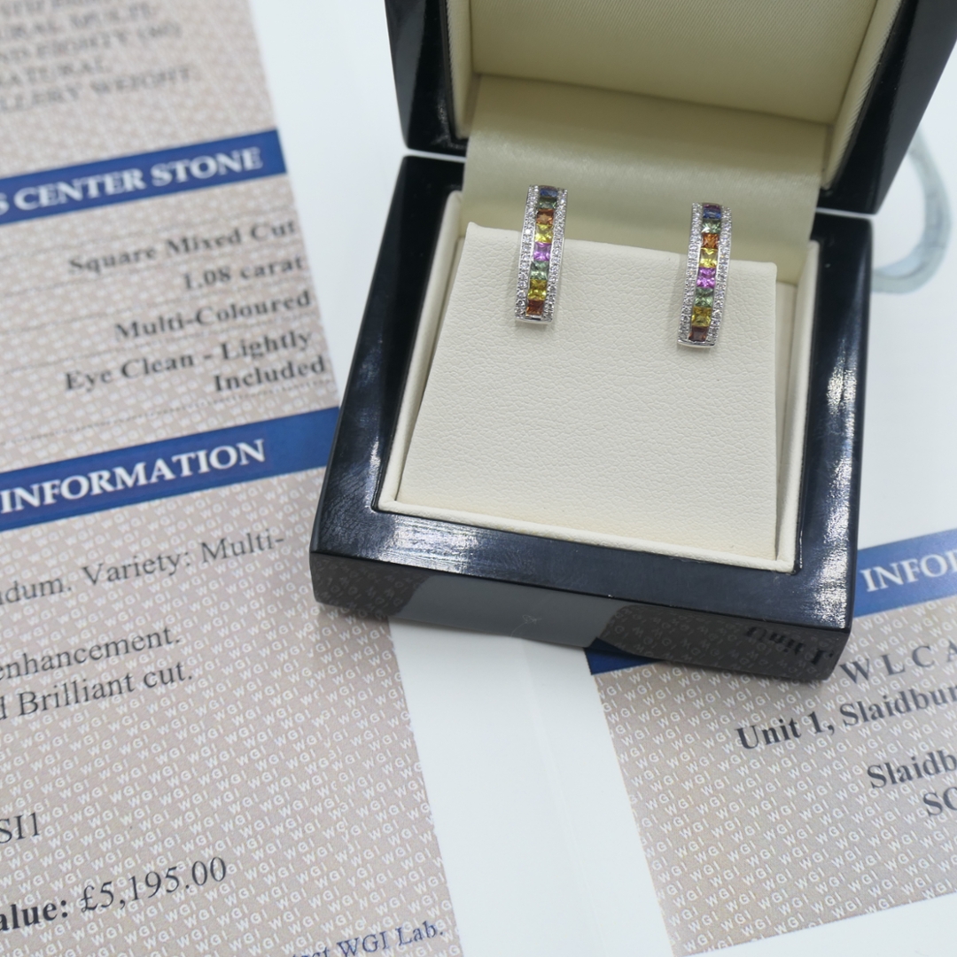 A brand-new, unused certified pair of 18ct white gold hooped earrings, combining vibrant colour with the timeless sparkle of natural diamonds. Each earring is set with a total of 1.08ct of square, mixed-cut, multi-coloured sapphires, carefully chosen for their rich tones, fine clarity, and lively brilliance. These sapphires form a captivating display of colour, beautifully complemented by 0.20ct of natural brilliant cut diamonds, graded G-H in colour and VS2-SI1 in clarity. The crisp radiance of the diamonds enhances the cool elegance of the white gold, creating a refined contrast that makes these earrings both eye-catching and sophisticated.