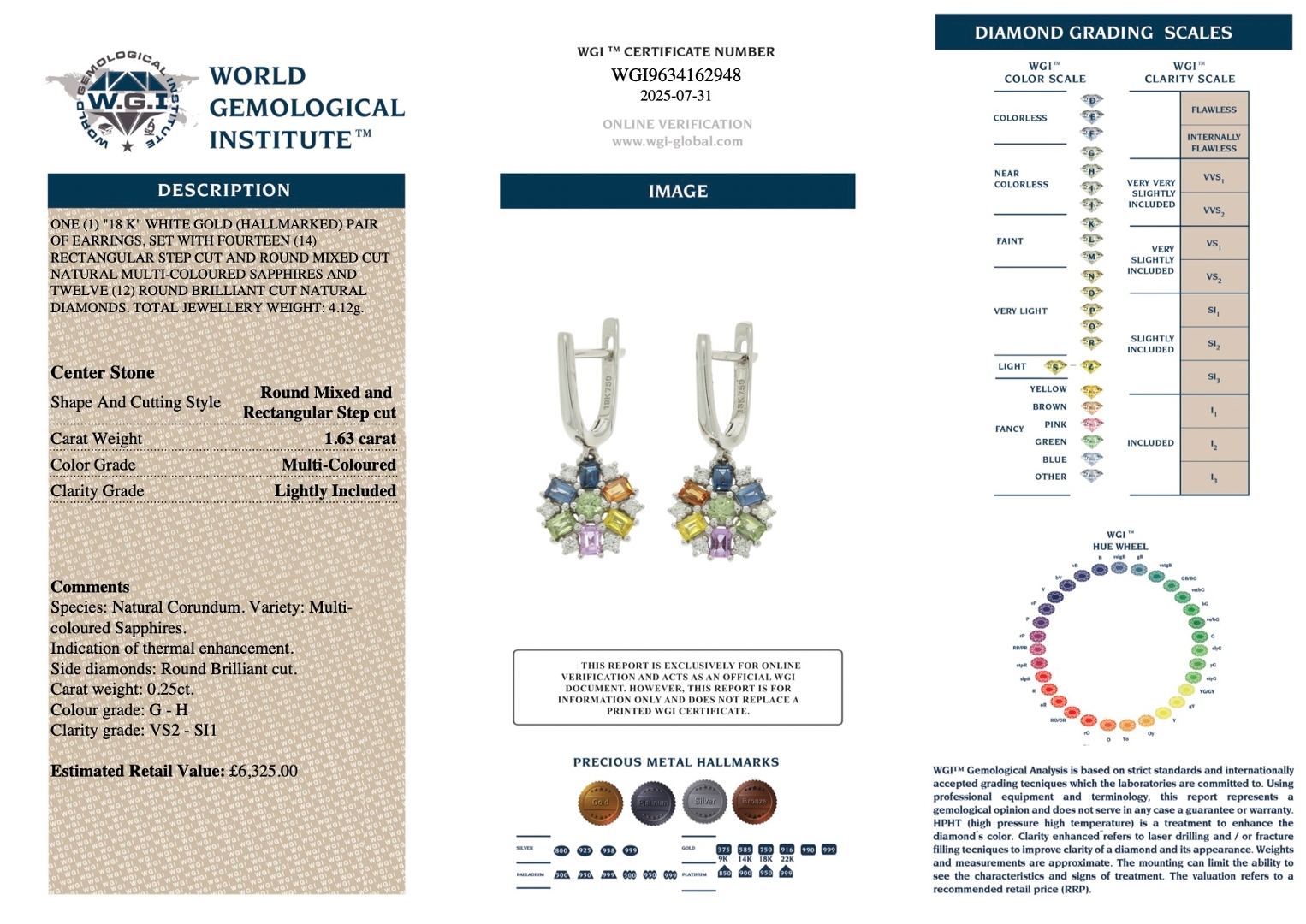 A brand-new, unused certified pair of 18ct white gold droplet earrings that combine refined elegance with a captivating burst of colour. These beautifully crafted earrings are set with 1.63ct of round, mixed-cut, and rectangular step-cut multi-coloured sapphires, each gemstone carefully chosen for its vivid tone, fine clarity, and brilliant sparkle. The arrangement of varied shapes and colours creates a striking visual harmony, enhanced by 0.25ct of natural, brilliant-cut diamonds, graded G-H in colour and VS2-SI1 in clarity. The diamonds’ crisp radiance contrasts perfectly with the cool sheen of the white gold, while the droplet design allows the gemstones to move gracefully and catch the light from every angle.