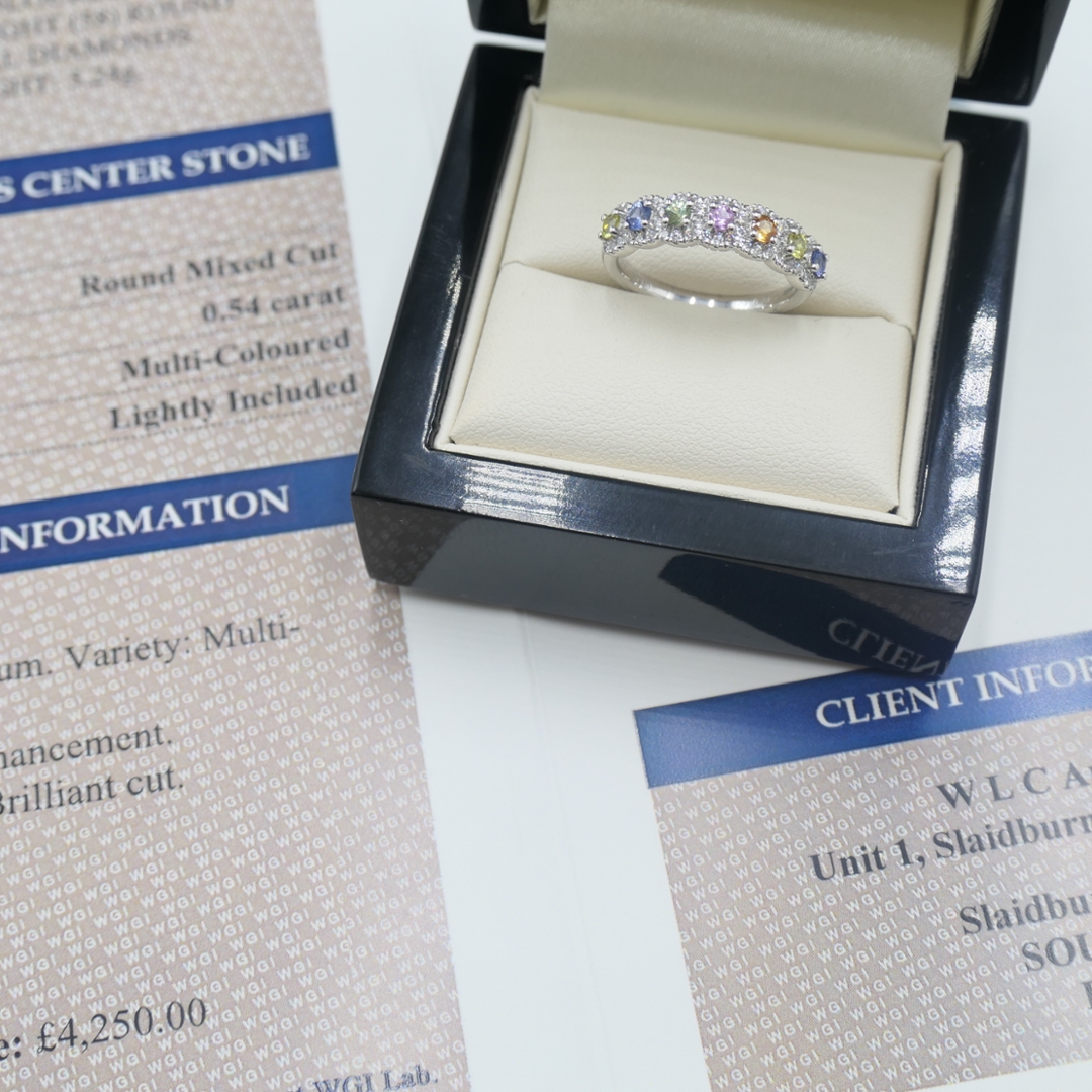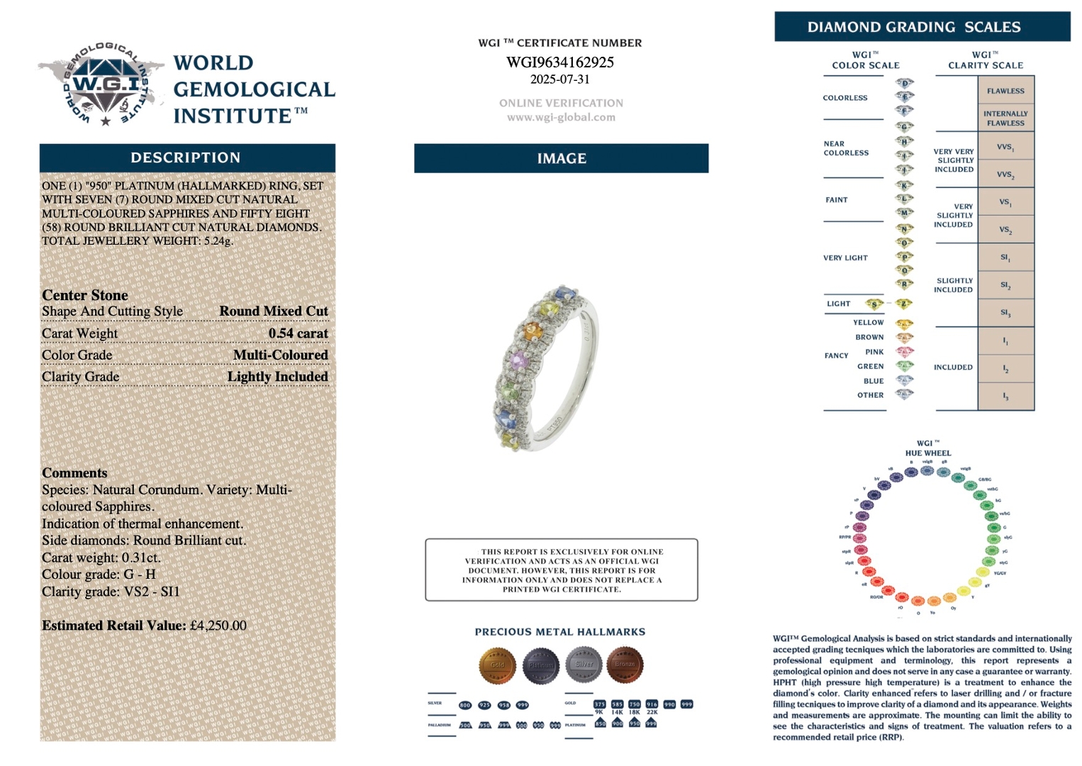 A brand-new, unused certified platinum ring, crafted to highlight a striking combination of vibrant colour and refined sparkle. At its centre sits a cluster of round, mixed-cut, multi-coloured sapphires, totalling 0.54ct, each gem offering a vivid, unique hue. Surrounding this colourful display is a halo of brilliant-cut natural diamonds, with a total weight of 0.31ct, graded G-H in colour and VS2-SI1 in clarity. The cool, sophisticated tone of the platinum setting enhances the diamonds' brilliance and intensifies the rich tones of the sapphires, resulting in a truly eye-catching, elegant design. Weighing 5.24 grams.