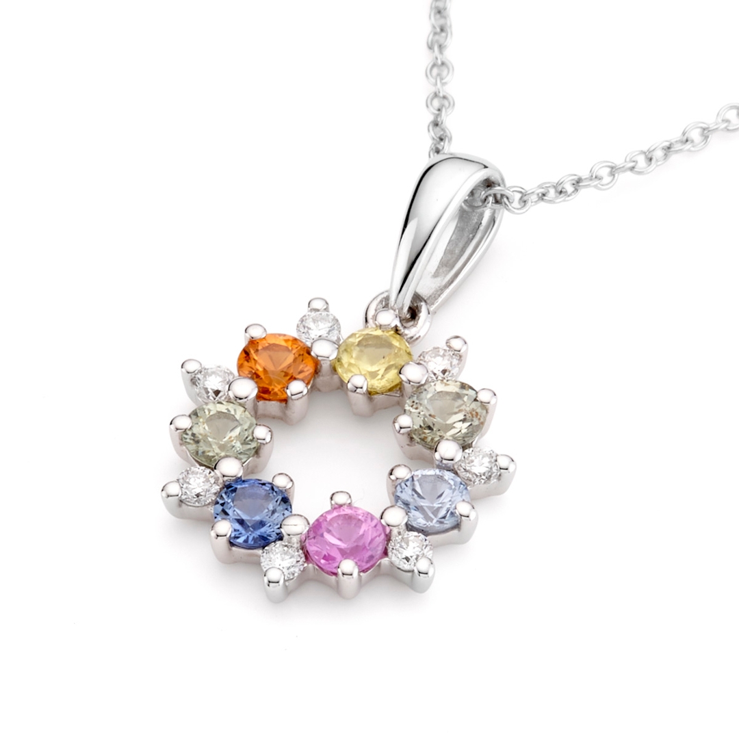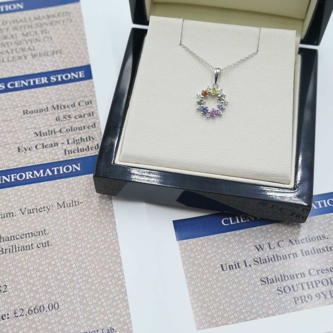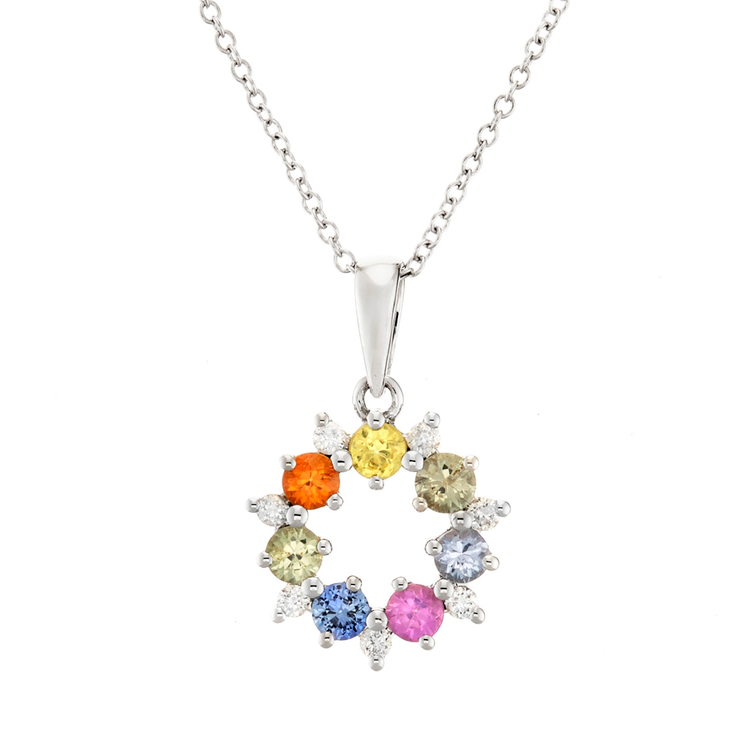 A brand-new, unused certified 18ct white gold pendant that beautifully blends vibrant colour with refined brilliance. Its cluster design features 0.55ct of round, mixed-cut, multi-coloured sapphires, each gemstone carefully selected for its rich hue and lively sparkle, arranged to create a striking display of colour. Interwoven among the sapphires, 0.09ct of natural, brilliant-cut diamonds, graded G-H in colour and VS1-VS2 in clarity, provide a crisp, radiant shimmer that enhances the pendant’s overall elegance. The sleek white gold setting offers a cool, modern backdrop, allowing both the sapphires and diamonds to shine in perfect harmony.