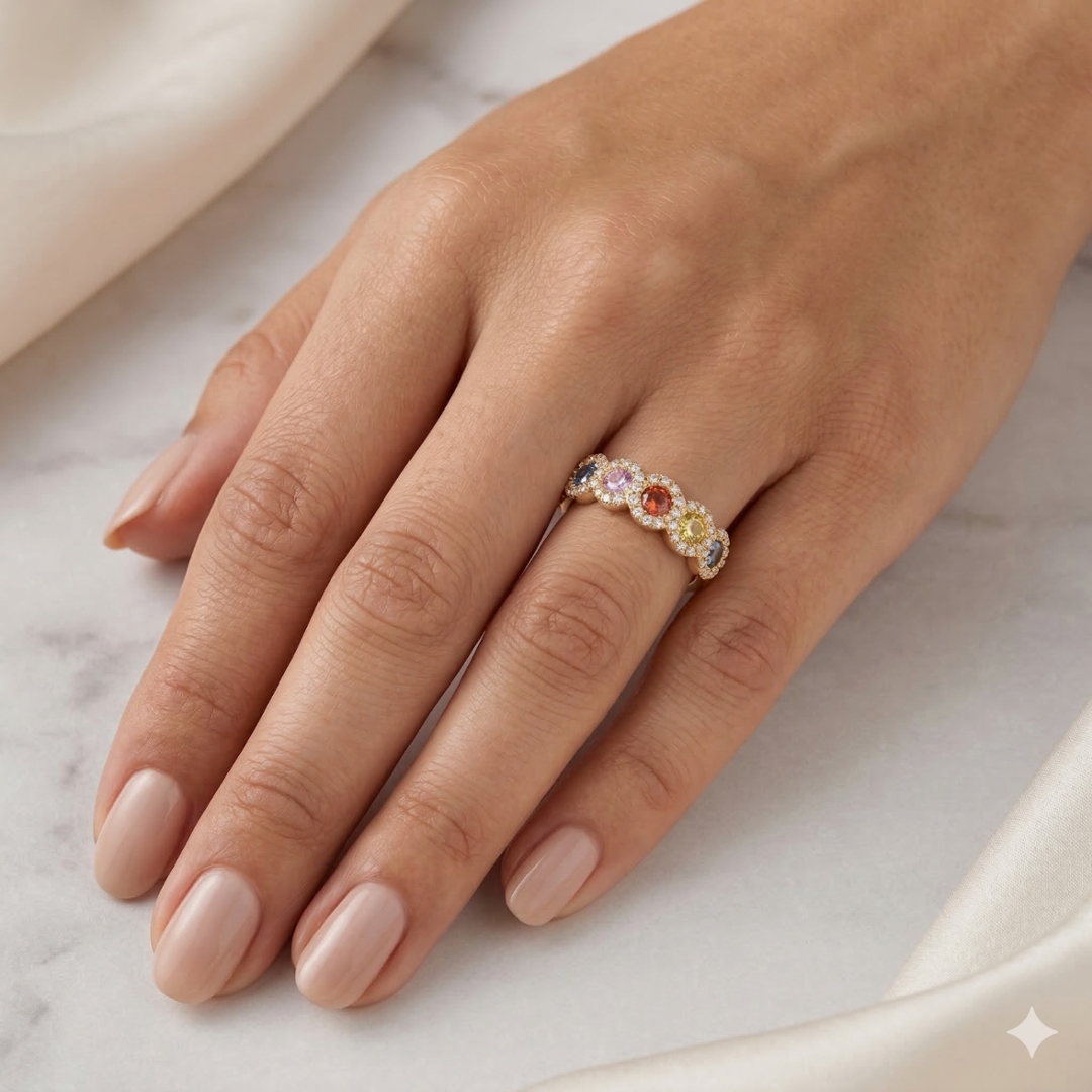 Combining the joyful vibrancy of multi-coloured sapphires with the everlasting sparkle of natural diamonds, this exquisite ring is a celebration of colour, quality and craftsmanship — a radiant piece designed to delight today and endure beautifully for generations to come.