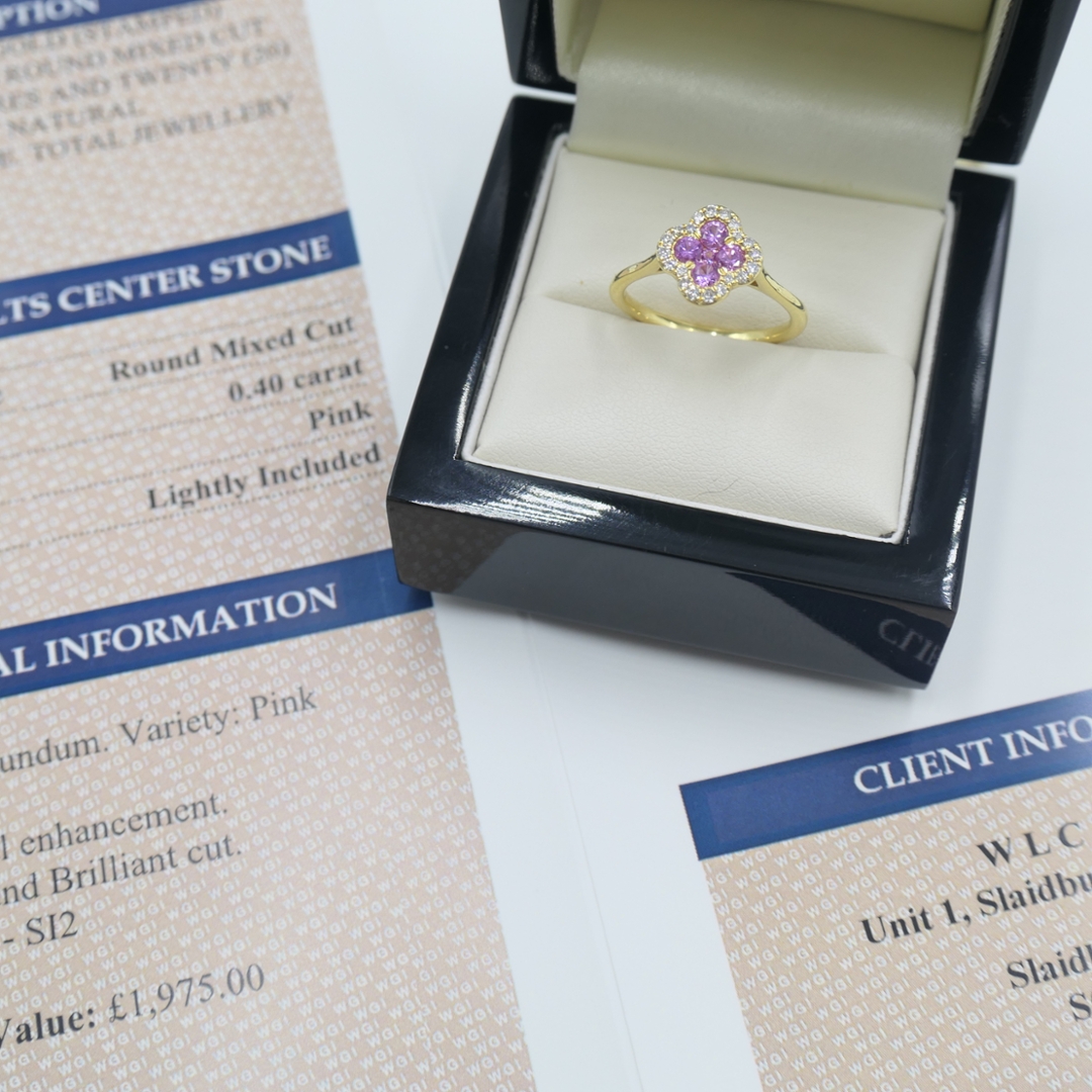 A brand-new, unused certified 18ct yellow gold four-leaf clover cluster ring, blending natural pink sapphires with the timeless brilliance of natural diamonds. At its centre, five round, mixed-cut pink sapphires form a delicate floral motif, totalling 0.40ct. Their soft pink hue carries associations of romance, femininity and good fortune, while their rarity enhances both their beauty and collectability. Surrounding the sapphires is a halo of twenty round brilliant-cut diamonds, weighing 0.15ct in total. These stones, graded F–G in colour and SI1–SI2 in clarity, lend the piece exceptional sparkle, lifting the design with light and fire.