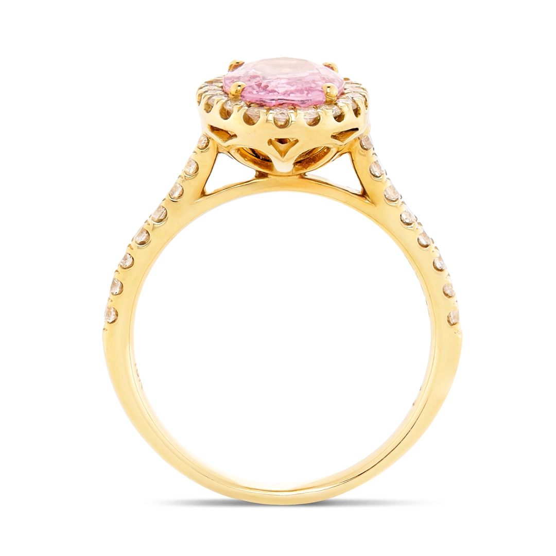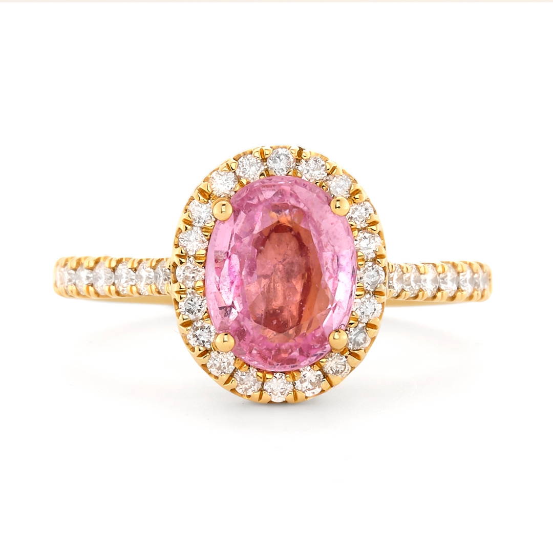 A brand-new, unused certified 18ct yellow gold cluster ring that radiates elegance, featuring a captivating natural pink sapphire as its centrepiece. The oval mixed-cut sapphire weighs an impressive 2.22ct and displays a refined pink hue, a colour long cherished for its rarity and association with romance, grace, and prosperity. Surrounding this gemstone, thirty-six brilliant-cut natural diamonds form a halo and extend gracefully onto the shoulders of the ring. With a combined diamond weight of 0.49ct, each stone is graded F–G in colour and SI1–SI2 in clarity, offering a luminous sparkle that perfectly complements the vivid charm of the sapphire.