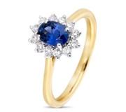 A brand-new, unused, certified 18ct yellow gold natural diamond & pink sapphire gemstone oval-shaped cluster ring, set with one oval mixed-cut pink sapphire gemstone at the centre & a cluster of brilliant-cut diamonds in a halo setting on the shoulders.