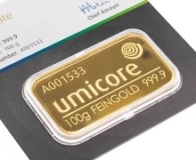 100 Gram Umicore Gold Mint Bar.
