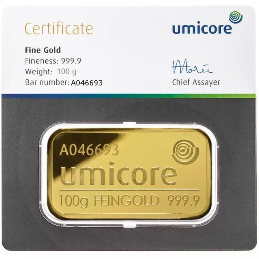 A 100 Gram Umicore Gold Mint Bar manufactured in Belgium, struck from 999.9% fine 24 carat gold and containing a full 100 grams of pure gold. Produced by Umicore, one of Europe’s most established and internationally recognised precious metals refiners, this bar represents precision, trust and outstanding bullion quality.