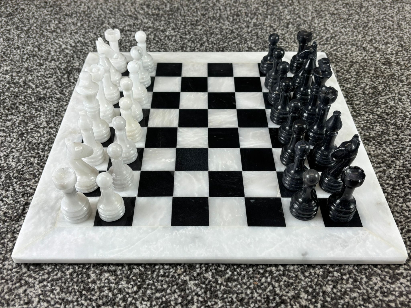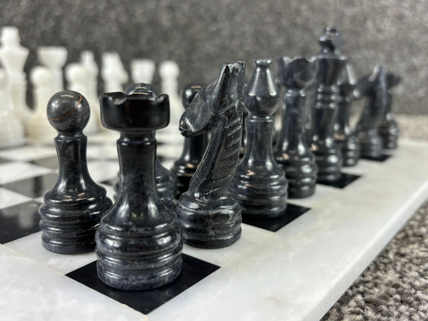 A black and white hand carved marble chess set that brings together timeless design and fine craftsmanship. Each piece is meticulously crafted from natural marble, resulting in a smooth finish with elegant details that make every move feel refined. The contrasting black and white tones add a striking visual appeal, while the weight of the marble gives the set a solid, luxurious presence. Measuring approximately 12 inches by 12 inches, it is an ideal size for both play and display.