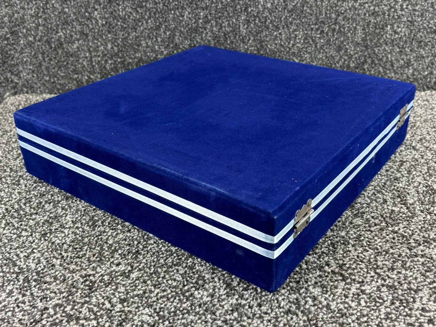To complete the offering, it comes with a rich velvet storage case, lined and fitted for safekeeping. The deep blue case with its secure closure ensures the set remains protected, stylish, and ready for use.