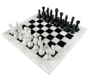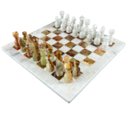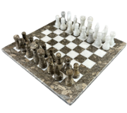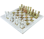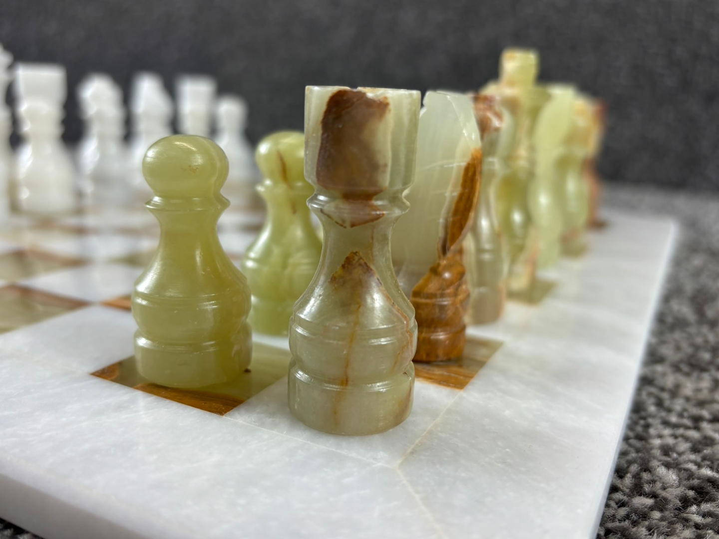 A green and white hand carved marble chess set that combines natural artistry with the elegance of traditional gameplay. Each piece is sculpted from richly veined marble, showcasing soft green, earthy brown, and creamy white tones that make every figure unique. The smooth finish and weight of the stone give the set a luxurious feel, while it's compact 12-inch by 12-inch size makes it perfect for both display and play.