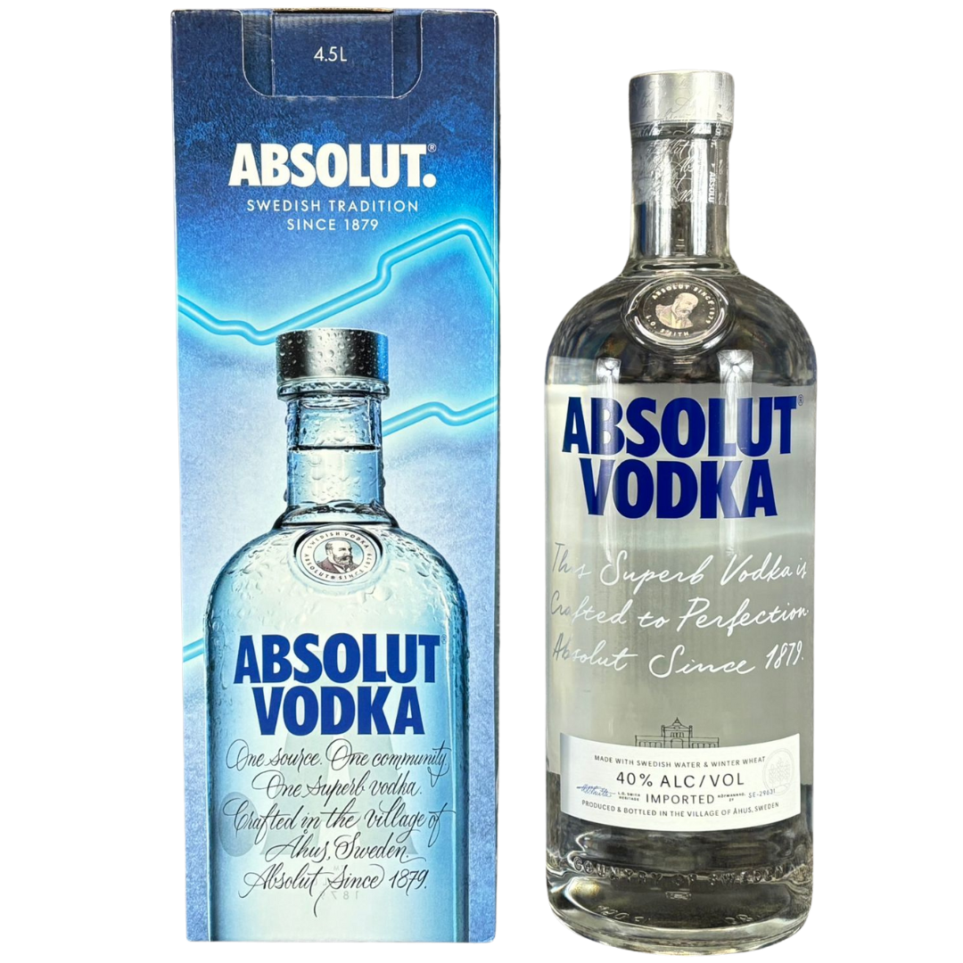 A 4.5-litre bottle of Absolut Vodka, presented here in its impressive large-format box exactly as shown in the image. The packaging features the classic frosted-bottle design, the bold ABSOLUT VODKA branding and the signature script emphasising its Swedish heritage since 1879. The box clearly states the 4.5L volume at the top, confirming this as the giant, party-sized edition — a real statement piece for any event or collection.