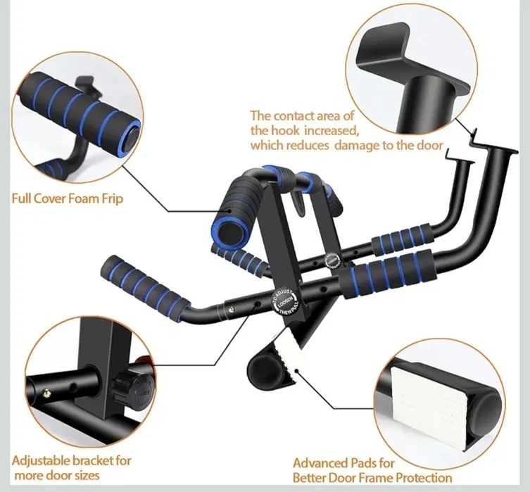 An Adjustable Door Frame Pull Up Bar with Multi-Grip Handles & Foam Protection Pads.