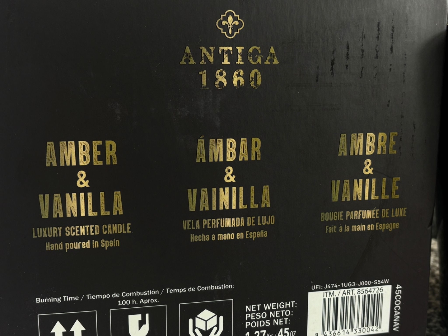 An Antiga 1860 Amber & Vanilla Luxury Scented Candle, weighing an impressive 1.27kg, this piece is crafted to elevate any interior with both style and fragrance. Housed in a sleek black glass vessel with a gold label, it exudes a refined, modern elegance that makes it ideal for gifting or enhancing a sophisticated living space. The three-wick design ensures an even burn and a fuller fragrance release, creating an inviting ambience from the moment it is lit.