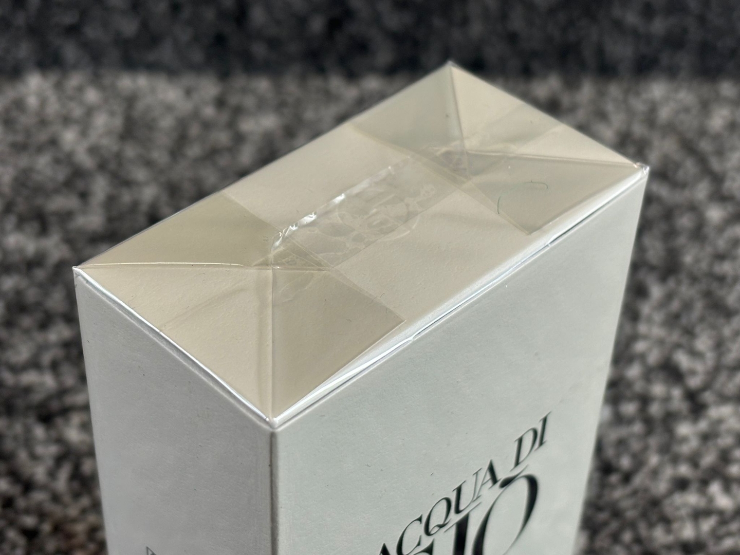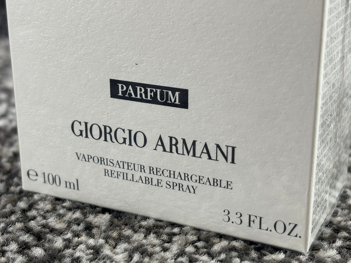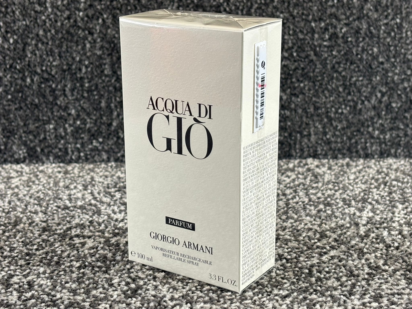 A 100ml bottle of Armani Acqua di Gio Parfum, presented in its