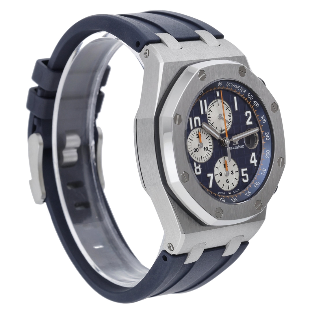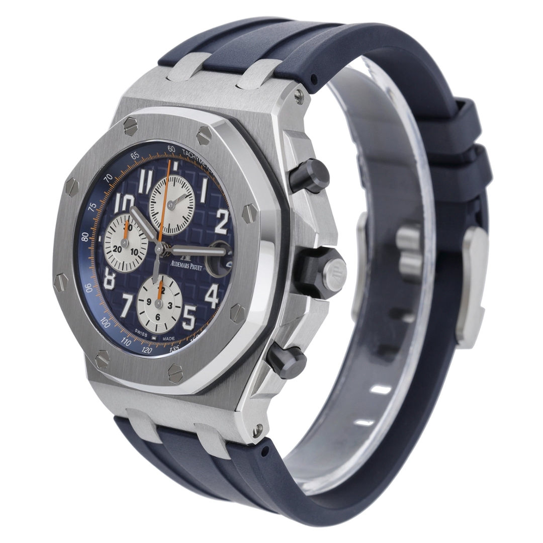 An Audemars Piguet Royal Oak Offshore Chronograph 26470ST.OO.A027CA.01 in stainless steel, presented on a blue rubber strap with stainless steel clasp. The 42mm case features the unmistakable octagonal bezel with exposed screws and a brushed finish that highlights its architectural design. The blue Méga Tapisserie dial is paired with contrasting white chronograph sub-dials, bold Arabic numerals and orange accents, while the tachymeter scale and date aperture at 3 o’clock reinforce its dynamic, sport-focused aesthetic.